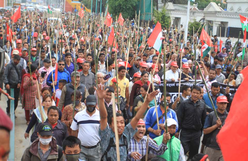 काठमाडौं, एमाओवादी नेतृत्वको ३० दलीय विपक्षी मोर्चाका तर्फबाट मोर्चासम्बद्ध युवाहले आइतबार राजधानीलगायत देशभर भाटेजुलुस प्रदर्शन गरे ।