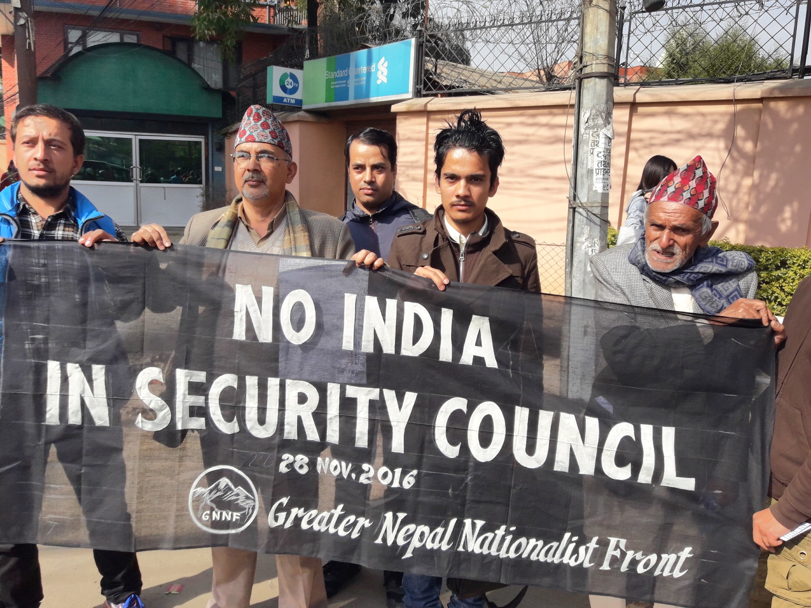 \"2016-11-28-12-43-17-264\"काठमाडौं,१३ मंसिर । भारतले संयुक्त राष्ट्रसंघको सुरक्षा परिषद्को स्थायी सदस्यताका लागि गरिरहेको प्रयास र माग दाबीका विरुद्ध सोमबार ग्रेटर नेपालले एक ज्ञापनपत्र पेश गरेको छ । सोमबार बिहान ११ः३० बजे ग्रेटर नेपाल राष्ट्रवादी मार्चाले संयुक्त राष्ट्र संघका महासचिव बान कि–मुनलाई ११ बुँदे ज्ञापनपत्र बुझाएको हो । मार्चाले मुनलाई नेपालस्थित संयुक्त राष्ट्रसंघका कन्ट्री डाइरेक्टरका प्रतिनिधि रामबाबु शाहलाई ज्ञापनपत्र बुझाएको हो । मोर्चाका अध्यक्ष फणिन्द्र नेपालले ज्ञापनपत्र बुझाएपछि प्रतिनिधि शाहले विषयको गम्भिरतालाई हेरेर यो ज्ञापनपत्र आजै महासचिव बान कि–मुन समक्ष पठाइदिने जानकारी दिएका थिए । उक्त ज्ञापनपत्रमा नेपाल विरुद्ध भारतले गरेका ज्यादतीहरुको फेहरिस्तका साथै सार्कक्षेत्रमा सैनिक दम्भ देखाउने भारत संयुक्त राष्ट्रसंघको सुरक्षा परिषद्मा रहन योग्य नभएको जिकिर गरिएको छ । भारतलाई सुरक्षा परिषद्मा पु¥याउने हो भने उसले छिमेकी मुलुकहरुमाथि चरम ज्यादती गर्ने बैधानिक प्रमाणपत्र पाएको ठहरिनेछ, ज्ञापनपत्रमा भनिएको छ । ज्ञापनपत्रको पूर्ण पाठ यस प्रकार छ ।