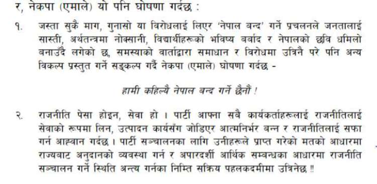 काठमाडौं, १६ मंसिर । संविधान संशोधनको विपक्षमा खडा भएको प्रमुख प्रतिपक्षी दल नेकपा एमालेको नेतृत्वमा बुधबारबाट घोषित आन्दोलनले हिंसात्मक रुप लिन थालेको छ । दोस्रो संविधानसभाको चुनावी घोषणापत्रमा जस्तोसुकै परिस्थिति आएपनि बन्द हड्ताल नगर्ने प्रतिवद्दता सार्वजनिक गरेको एमालेले नीजि सवारीहरुसमेत तोडफोड गर्नुले उसको घोषणापत्र र प्रतिवद्दतामाथि प्रश्न उठ्न थालेको छ । [caption id=\"attachment_104775\" align=\"alignleft\" width=\"750\"]\"एमालेले एमालेले सबैभन्दा पछिल्लो चुनावको घोषणापत्रमा जनाएको प्रतिवद्दता[/caption] ५ नं. प्रदेशबाट केही पहाडी जिल्लाहरुलाई अलग्याएर ४ नं. प्रदेशमा गाभ्ने गरी आएको संशोधन विद्येयक विरुद्दको आन्दोलनलाई बुटबलमा केन्द्रित गरेर एमालेले नेतृत्व गरिरहेको छ । \"butwal_gadi-jalaeyo\"एमालेको अगुवाईमा भएको आन्दोलनबाट बुधबार लुम्बिनी अन्चलका प्राय जिल्ला अघोषित बन्द भए भने बिहिबारबाट घोषितरुपमै बन्द गरिएका छन् । बुटबलको देवदश खैरेनीमा एक नीजि कारमा आगजनि गरिएको छ भने सडकहरुमा हानिकारक प्रदुशण पैदा गर्ने टायर बालेर प्रर्दशन गरिएको छ । काठमाडौंमा एमालेकै भातृसंगठन अखिल र युवासंघले सरकारी गाडीमा तोडफोड गर्नुका साथै विना सार्वजनिक सुचना राजधानीको मुटु मानिने बानेश्वर क्षेत्रमा बुधबार सार्वजनिक सवारी आवागमन ठप्प पारेका थिए ।\"pardarsan\"