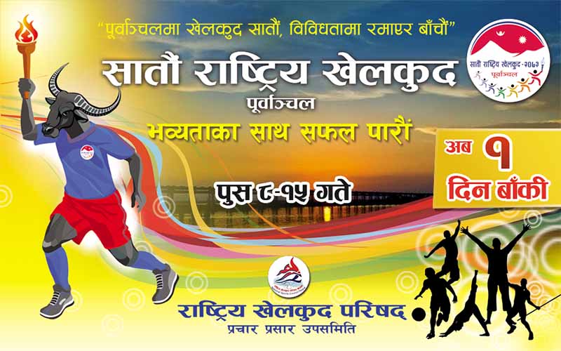 \"\" विराटनगर, ७ पुस । सातौँ राष्ट्रिय खेलकुद शुक्रबारदेखि पूर्वाञ्चलमा सुरु हुँदै छ । साताव्यापी जारी रहने सो प्रतियोगितामा विभिन्न ३५ खेलमा २९४ स्वर्ण, २९४ रजत र ४४७ कास्य गरी एक हजार ३५ पदकका लागि प्रतिस्पर्धा हुनेछ । सो प्रतिस्पर्धामा तीन हजार ९७२ जना खेलाडीको सहभागिता रहने आयोजक ले जनाएको छ । प्रतियोगिताबारे जानकारी दिँदै युवा तथा खेलकुदमन्त्री दलजीत श्रीपाइलीले प्रतिभावान् खेलाडीको खोजीमा सातौैँ राष्ट्रिय खेलकुदले महत्वपूर्ण भूमिका निर्वाह गर्ने विश्वास व्यक्त गरे । उनले सन् २०१९ मा नेपालमा हुने सार्क खेलकुदमा उत्कृष्ट प्रदर्शन गर्ने खेलाडी छनोट गर्नमा पनि यो प्रतियोगिता उपयोगी हुने बताए । राष्ट्रपति विद्यादेवी भण्डारीले प्रतियोगिताको भोलि विराटनगरको सहिद रङ्गशालामा एक भव्य समारोहबीच उद्घाटन गर्नेछिन् । प्रतियोगितामा सहभागी हुन खेलाडी र प्रशिक्षकलगायत विराटनगर आउनेक्रम जारी रहेको र सबै तयारी पूरा भइसकेको आयोजक समितिले जनाएको छ ।