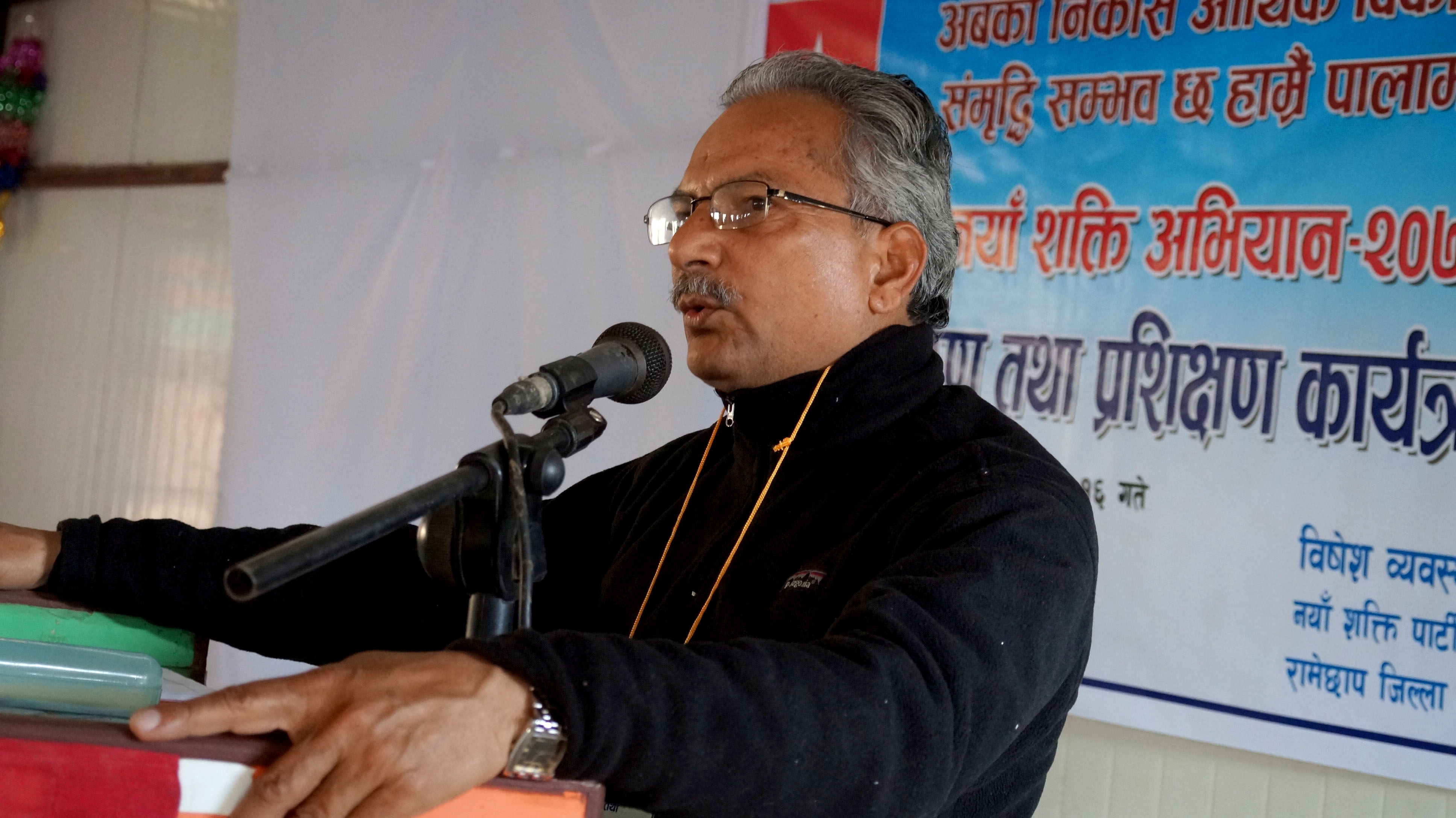 \"\" रामेछाप, १५ पुस । नयाँ शक्ति पार्टी नेपालका संयोजक डा. बाबुराम भट्टराईले माओवादीसँगको एकताको कुरा गलत भएको बताएका छन् । नयाँ शक्ति नेपाल ३ नं. प्रदेशले शुक्रबार रामेछापको मन्थलीमा आयोजना गरेको अभिमुखीकरण तथा प्रशिक्षण कार्यक्रमलाई सम्बोधन गर्दै उनले नयाँ शक्ति पार्टी वैकल्पिक शक्ति भएकोले पुराना शक्तिहरुसँग एकता हुन नसक्ने बताएका हुन् । ‘हामी नयाँ शक्ति हौं, पुरानो शक्तिसँग एकता हुन सक्दैन’ उनले भने, ‘यदि पुराना शक्तिहरु रुपान्तरित भएर पुरानो विचार त्यागेर आए भने ती पार्टीहरुसँग धुव्रीकरण हुनसक्छ । तर, पुरानो शक्तिमा फर्किने कुरा कल्पना सम्म गर्न नसकिने कुरा हो’ माओवादीसँग एकता हुन लागेको भन्ने हल्ला चलेको प्रति संकेत गर्दै उनले भने, ‘उहाँहरु रुपान्तरण भएर, नयाँ बनेर आउनुभयो भने उहाँहरुलाई पनि समावेश गर्न सकिन्छ, तर, उहाँहरुले जसरी अन्ध ढंगबाट प्रचार गरिरहनुभएको छ, त्यो ठीक छैन’, ‘संकट उहाँहरुलाई छ, उहाँहरु रुपान्तरित भएर आउनुभयो भने स्वीकार हुने कुरा हो’ भट्टराईले नयाँ शक्ति नेपालको काँधमा संविधान कार्यान्वयनको जिम्मेवारी भएको भन्दै उनले त्यसका लागि आवश्यक भूमिका निर्वाह गर्नुपर्ने बताए । ‘संविधान कार्यान्वयन भएर देशमा राजनीतिक स्थायित्व कायम गरेर अघि बढ्नु अबको एजेण्डा हो, त्यो जिम्मेवारी नयाँ शक्तिको काँधमा छ’ उनले भने । उनले संविधानमा आदिवासी, जाजाति, मधेशी थारुहरुको मागलाई सम्बोधन गरेर जाँदा मात्र संविधान कार्यान्वयन सहज हुन सक्ने भन्दै संविधानमा असन्तुष्ट पक्षहरुको मागलाई पूरा गरेर संविधान कार्यान्वयनका लागि आन्दोलनकारी शक्तिहरुले उठाएको माग र संघीयता र प्रदेशहरुको सीमांकनको विवाद राज्य पुनःसंरचना समिति र आयोगले दिएको प्रतिवेदनका आधारमा गरिनुपर्नेमा जोड दिए ।