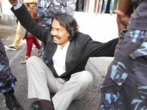 झापा, मधेसलाई छुट्टै राज्य बनाउने अभियानमा लागेका सीके राउतलाई शनिबार झापाको राजगढबाट प्रहरीले पक्राउ गरेको छ । आजको अन्नपूर्ण पोष्ट दैनिकमा खबर छ–आमसभा स्थलबाट शनिबार दिउसो ३ बजे झापा प्रहरीेले उनलाई पक्राउ गरेको हो । राउतले राजगढमा कार्यकर्तालाई सम्बोधन गर्न आमसभालाईको आयोजना गरेका थिए । उनलाई जिल्ला प्रहरी कार्यालयको हिरासतमा राखिएको झापाको प्रवंक्ता प्रहरी नायब उपरीक्षक विश्वमणि पोखरेलले जानकारी दिए । प्रहरीले राउतका सहयोगी दिपेन्द्र महतोलाई पनि पक्राउ गरेको छ । प्रशासनले आमसभा गर्न नदिनु शुक्रबारदेखि राजगढमा सयौंको संख्यामा प्रहरी परिचालन गरेको थियो । प्रशासनले ठूलो संख्यामा प्रहरी परिचालन गरेको थाहा पाएपछि राउत नआएने हल्ला फैलाइए पनि अपरान्हपछि राउतलाई कार्यक्रमस्थलबाटै प्रहरीले नियन्त्रणमा लिएको थियो । उनलाई नियन्त्रणमा लिने क्रममा कार्यक्रममा आएका मानिससमते प्रहरीको लाठीचार्जबाट घाइते भएको बताइएको छ । राउत समर्थकको ढुंगा प्रहारबाट प्रहरी नायव निरीक्षक मनोज खड्काको पातो खुस्किएको बताइएको छ । अर्का एक प्रहरी जवानसमेत घाइते भएका छन् । राउत शुक्रबार नै भद्रपुरको एक होटलमा बसेका थिए ।