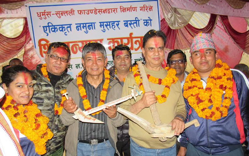 बर्दिबास, २६ पुस । ०७२ बैशाख १२ गतेको विनाशकारी भूकम्पपछि ध्वस्त बस्ति पुनर्निर्माण गरेर सामाजिक गरेको हास्यकलाकार सिताराम कट्टेल (धुर्मस) र कुन्जना घिमिरे (सुन्तली)बर्दिबासमा मुसहर नमुना बस्ति बनाउँदैछन् । यस अघि काभ्रे र सिन्धुपाल्चोकका भूकम्प पीडितका लागी नमुना बस्ति बनाएका उनीहले अहिले बर्दिबासको मुसहर गाउँमा नमुना बस्ति बनाउँदैछन् । मुसहरमा नमुना बस्त्किो शिलान्यास गर्न पुगेका मह जोडी मदनकृष्ण श्रेष्ठ र हरिवंश आचार्यले बस्ती बनाउन एक लाख रुपैयाँ सहयोग गरेका छन् । धुर्मुस सुन्तली फाउन्डेसनलाई शिलान्यास समारोहमै ३५ लाख बराबरको सहयोग जुटेको बताईएको छ । धुर्मुस सुन्तली यसरी ठाउँ ठाउँमा नमुना काम गरेर कला क्षेत्रको नाम राख्न सफल भएको भन्दै उनीहरुले शुभारम्भ कार्यक्रममै प्रशंशा गरेका थिए । उक्त नमुना कामको लागी एक लाख सहयोग गरेपछि हास्कलाकार श्रेष्ठ बिगत सम्झँदै भने ‘ हामीले दोस्रो जनआन्दोलनको घाइतेहरूको उपचार गर्न हामीले यसैगरी एक लाख रकम प्रदान गरेर उपचार कोष खडा गरेका थियौंउठेको थियो अब यो बस्ती बनाउन पनि रकम संकलनमा कुनै कमी हुने छैन् ।