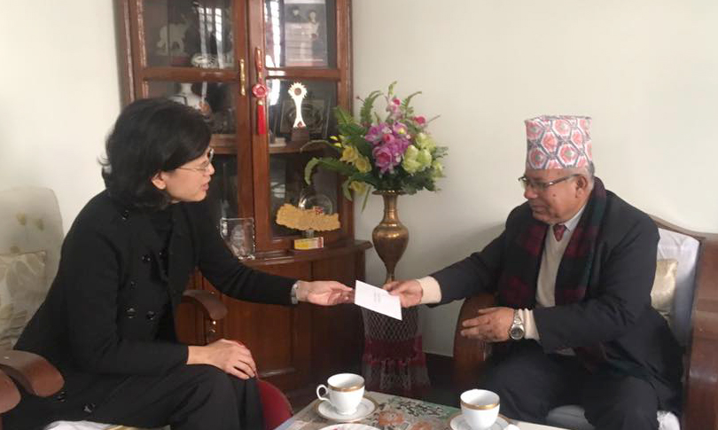\"\"काठमाडौँ, २८ पुस । नेकपा (एमाले)का नेता माधवकुमार नेपाल र नेपालका लागि चिनियाँ राजदूत यु हङबीच भेटवार्ता भएको छ । कोटेश्वरस्थित नेता नेपालको निवासमा भएको भेटमा राजदूत हङलाई स्वागत गर्नुका साथै उनको पूर्ण कार्यकालको सफलताको कामना गरे । नेपाल–चीन तथा आफ्नो पार्टी ९एमाले० र चिनियाँ कम्युनिस्ट पार्टीबीच सुमधुर एवम् ऐतिहासिक सम्बन्ध रहेको पनि पूर्व प्रधानमन्त्री नेपालले चर्चा गरे । नेपाल एक चीन नीतिको पक्षमा रहेको र नेपाली भूमिमा चीन विरोधी कुनै पनि गतिविधि नहोस् भन्नेमा नेपाल उनले उल्लेख गरेको नेता नेपालका स्वकीय सचिव मोहन गौतमले जानकारी दिए । चीनका वर्तमान राष्ट्रपति सी जिन पिङले अगाडि सारेको ‘वन बेल्ट वन रोड’को अवधारणाको स्वागत गर्दै नेता नेपालले सोही अवधारणाका आधारमा ऊर्जा, व्यापार, शिक्षा, स्वास्थ्य, पर्यटन, भौतिक पूर्वाधारलगायत आर्थिक समृद्धिका विविध क्षेत्रमा चिनियाँ सहयोगको अपेक्षा गरे । उनले राजदूतको कार्यकालमा नेपाल र चीनबीचको सम्बन्ध थप सुमधुर बन्ने तथा पारस्परिक लाभ एवम् सम्मानका आधारमा द्विपक्षीय सहयोग थप अभिवृद्धि हुने विश्वाससमेत व्यक्त गरे । भेटमा चिनियाँ राजदूतले नेपालजस्तो सुन्दर एवम् चीनसँग ऐतिहासिक सम्बन्ध भएको असल छिमेकी राष्ट्रको राजदूतका रुपमा जिम्मेवारी पाउँदा आफूलाई अत्यन्तै खुसी लागेको उल्लेख गर्दै आफ्नो कार्यकाललाई दुवै देशको हितको पक्षमा अधिकतम उपयोग गर्न प्रयास गर्ने धारणा राखेकी थिइन । नेपाल र चीनबीच विविध क्षेत्रमा भएको साझेदारी तथा सहयोगलाई आफ्नो कार्यकालमा अभिवृद्धि गर्ने सम्बन्धमा आफू प्रयासरत रहने उल्लेख गर्दै राजदूत हङले सार्वभौमसत्ता सम्पन्न नेपालले आन्तरिक विषयलाई आफ्नै विशिष्टताका आधारमा हल गर्न र संविधानको सफल कार्यान्वयनमा चीन सरकारको शुभेच्छा रहेको जानकारी गराएकी थिइन । रासस