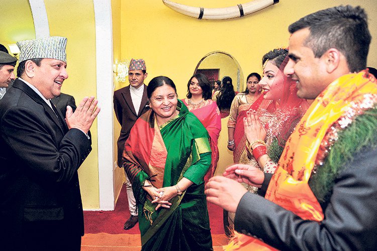\"\"काठमाडौं, ४ माघ । शीतलनिवासमा अघिल्लो दिनसम्म राष्ट्रपति विद्या भण्डारीकी छोरी र पूर्वसांसद् किरण यादवका छोराबीच हुने बिहेको चर्चा थियो तर सोमबार भने अधिकांश आगन्तुकको जिज्ञासा थियो, निम्ता मान्न पूर्वराजा शीतलनिवास आउलान् कि नआउलान् ? आजको अन्नपुर्ण पोस्टमा खबर छ– राष्ट्रपति कार्यालयको कोसीहलमा विवाहित जोडीलाई बधाई र शुभकामना कार्यक्रम भइरहँदा सोमबार धेरैको चासो ढोकाबाहिरै थियो । धेरैजसो पाहुना तथा सहभागी एकआपसमा जिज्ञासा राख्थे, ‘पूर्वराजा कति बजे आउँछन् ?\' राष्ट्रपति कार्यालयका कर्मचारी पनि भन्दै थिए, ‘उहाँ आउने कार्यक्रम छ ।\' लामो समय राष्ट्रप्रमुख भएका पूर्वराजा ज्ञानेन्द्र धेरैको उत्सुकतालाई चिर्दै सोमबार मध्याह्न साधारण निम्तालुसरह शीतलनिवास प्रवेश गरेर वरवधुलाई बधाई दिए । त्यसपछिका २० मिनेट पूर्वराजा नै त्यहाँका प्रमुख आकर्षण बनिरहे । उपस्थित धेरैले मोबाइलबाट उनको तस्बिर खिचे । मध्याह्न १२ बजेर ३५ मिनेट जाँदा राष्ट्रपति कार्यालय पुगेका पूर्वराजा गाडीबाट र्ओलिएर सीधै कोसीहल प्रवेश गरे । त्यसबेला राष्ट्रपति भण्डारी विवाहित जोडीसँगै बधाई र शुभकामना ग्रहण गर्न व्यस्त थिइन् । पूर्वराजाले वरबधुलाई बधाई र शुभकामना दिए । त्यसपछि भण्डारीसामुन्ने पुगे । दुवैले एकअर्कालाई नमस्कार गरे । ज्ञानेन्द्रले राष्ट्रपतिलाई पनि बधाई दिए । जबाफमा उनले ‘धन्यवाद\' भनिन् । यत्तिमै सकियो बधाई कार्यक्रम ! राष्ट्रपतिले पूर्वराजालाई दिवाभोजमा सरिक हुन हातले इसारा गरिन् । उनको सचिवालयका सहयोगीले दिवाभोजतर्फ लिएर गए । राष्ट्रपति कार्यालयको पछाडिपट्टिको बगैंचामा दिवाभोजको व्यवस्था थियो ।पूर्वराजा बगैंचातर्फ निस्कनासाथ एउटै टेबुलमा देखिए राप्रपा अध्यक्ष कमल थापा, उक्त पार्टीका राष्ट्रिय अध्यक्ष पशुपतिशमशेर राणा र नेता लोकेन्द्रबहादुर चन्द । पूर्वराजालाई देख्नेबित्तिकै उनीहरू जुरुक्क उठे र एकसाथ नमस्कार गरे । पूर्वराजा हँसिलो मुद्रामा उनीहरूसँगै एउटै टेबुलमा बसे । अनि सुरु भयो भलाकुसारी । आगन्तुकका लागि सिट वर्गीकृत नगरिए पनि कुर्सी सजाइएको बरण्डा अति विशिष्ट र बगैँचामा राखिएका कुर्सीहरू आम आगन्तुकका लागि प्रयोग भइरहेका थिए । सायद पूर्वराजासँग टाढिनैका लागि अति विशिष्ट श्रेणीमा पर्ने भए पनि राजालाई दाम चढाएर आलोचित बन्दै आएका एमाले नेता माधवकुमार नेपालले बगैँचामै बस्न रुचाए । समारोहमा उपस्थित सिविल ड्रेसमा रहेका प्रधानसेनापति राजेन्द्र क्षेत्रीले आफ्ना पूर्व परमाधिपतिलाई ससम्मान स्यालुट चढाए । बसाइका क्रममा पूर्वराजाले एक कप चिया खाएका थिए । उनले भोजन भने गरेनन् । अन्त्यमा हँसिलो मुद्रामा उठेर सबैलाई नमस्कार गर