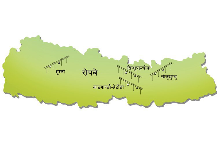 \"\"काठमाडौं, २२ माघ । सरकारले हेटौंडा-मातातीर्थ रोपवे पुनःसञ्चालन गर्न तयारी थालेको छ । भौतिक निर्माण तथा यातायात मन्त्रालयका सचिव धनबहादुर तामाङले हेटौंडादेखि मातातीर्थसम्मको ४२.३ किलोमिटरको यो रेपवे (रञ्जुमार्ग) फेरि सञ्चालन गर्न आवश्यक तयारी थालिएको जानकारी दिए । उनका अनुसार सञ्चालन मोडालिटीका सम्बन्धमा छलफल सुरु भएको छ । अाजको अन्नपूणर्ण पोस्टमा खबर छ– तत्कालीन राणा प्रधानमन्त्री चन्द्र शमशेरले सन् १९२७ मा धुर्सिङदेखि मातातीर्थसम्मको २२ किलोमिटर रोपवे सञ्चालनमा ल्याएका थिए । यो रोपवे २०५४ सालदेखि बन्द छ । यसलाई राणकालीन यातायात साधनका रूपमा लिइन्छ । प्रतिघन्टा आठ टन सामान बोक्ने यो रोपवेलाई १९६४ मा विस्तार गरेर हेटौंडादेखि मातातीर्थसम्मको ४२ किलोमिटरको दूरीमा सञ्चालनमा ल्याएको थियो । रोपवे सञ्चालनको दूरी बढेसँगै यसको क्षमता पनि २५ टन पुगेको थियो । सञ्चालनका लागि रोपवे नेपालले आवश्यक अध्ययनसमेत थालिसकेको छ । स्विस कम्पनीको प्राविधिक सहयोग र भारतीय कम्पनी हिम केबलवेजसँगको सहकार्यमा अध्ययन थालिएको रोपवे नेपालका अध्यक्ष गुणराज ढकालले जानकारी दिए । ढकालका अनुसार कम्पनीले पहिलेको अवस्था, सञ्चालनको आवश्यकता र यसको महत्वबारेमा अध्ययनप्रतिवेदन तयार पार्नेछ । पुनःसञ्चालन सम्भावना, यसलाई सञ्चालन गरेर लिन सकिने लाभसहितको पूर्ण अध्ययन प्रतिवेदन तयार पार्दासम्म करिब २० लाख रुपैयाँ खर्च लाग्ने अनुमान रोपवे नेपालको छ । दक्षिण एसियाकै पहिलो रोपवे नेपालको ऐतिहासिक महत्व बोकेको र सडक मार्गको तुलनामा ढुवानीमा निकै सस्तो एवं लोकप्रिय रहेकैले पनि पुनःसञ्चालनको सम्भावना रहेको ढकालको बुझाइ छ । रोपवे नेपालले एक महिनादेखि अध्ययनको काम सुरु गरिसकेकाले आगामी चार महिनाभित्रमा प्रतिवेदन बुझाउने उल्लेख छ । सगरमाथा रोपवे एक वर्षभित्रै सोलुखुम्बुको लुक्लाबाट नाम्चेसम्मको १२ किलोमिटरमा सञ्चालन हुने सगरमाथा रोपवे आगामी एक वर्षभित्रमा सञ्चालनमा आउने भएको छ । रोपवे नेपालले गरेको एक अध्ययनबाट यो स्थानमा रोपवे सञ्चालनको सम्भावना देखिएकाले काम अगाडि बढाउन लागिएको हो । सगरमाथा आरोहणमा जाने र आउने पर्यटक तथा स्थानीयको सुविधाका लागि यो रोपवे सञ्चालन गर्न लागिएको सगरमाथा रोपवेका अध्यक्ष एवं पर्यटन व्यवसायी निमानुरु शेर्पाले बताए । उनका अनुसार दुई हजार केजी क्षमतासम्मको हुने यो रोपवेमा दुईवटा गोन्डोला (सामान बोक्ने डिब्बा) सञ्चालन हुनेछन् । स्थानीयलाई न्यून दरमा सेवा दिने र पर्यटन प्रवद्र्धन तथा स्थायित्वका लागि रोपवे निकै प्रभावकारी हुने अनुमान शेर्पाको छ । यो रोपवे निर्माणमा भारतीय प्रणाली अपनाउँदा करिब ५० करोड र युरोपेली प्रणाली