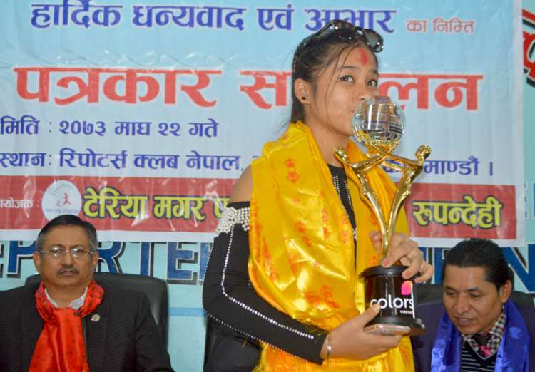 \"\"तिलोत्तमा (रुपन्देही), २६ माघ । भारतीय टिभी च्यानलमा ‘झलक दिखला जा’को उपाधि प्राप्त गर्न सफल रुपन्देही रुद्रपुरकी टेरिया फौजामगरलाई मङ्गलबार गृह जिल्लामा भव्य स्वागत गरिएको छ । टेरिया मगर फाउन्डेसनले बुटवलमा गरेको कार्यक्रममा रुपन्देहीका प्रमुख जिल्ला अघिकारी, स्थानीय विकास अधिकारी, जिल्ला शिक्षा अधिकारीलगायतले उनको सम्मान गरेका हुन् । बुटवलको बागेश्वरी सङ्गीतालयमा नृत्य कक्षा सुरुवात गरेकी टेरियाले सन् २०१४ मा भारतीय च्यानल जी टिभीबाट प्रसारण हुने ‘डान्स इन्डिया डान्स’को लिटिल मास्टर्स प्रतियोगितामा प्रथम भएकी थिइन् । उनले हालै मात्र कलर्स टिभीबाट प्रसारण भएको ‘झलक दिखला जा’ को उपाधि समेत प्राप्त गरेकी थिइन् । फाउन्डेसनका अध्यक्ष कृष्णबहादुर फौजामगरले टेरियाले उपाधि जित्दा स्वदेश तथा विदेशबाट नेपाली दाजुभाइ दिदीबहिनीले एसएमएस र अनलाइन भोट गरेर गरेको सहयोगप्रति आभार व्यक्त गरे । सो अवसरमा रुपन्देही जिल्लाका प्रमुख जिल्ला अधिकारी विनोदप्रकाश सिंहले नेपाल र नेपालीको इज्जत विदेशी भूमिमा पुगेर राखेको भन्दै धन्यवाद व्यक्त गरे । उनले टेरियाको जित सबै नेपालीको गर्व र उपलब्धि रहेको बताए । उनले नेपाली परम्पराका नृत्यलाई विदेशी भूमिबाट नृत्यको माध्यमबाट अझ प्रचारप्रसार गर्न आग्रह गरे । कार्यक्रममा स्थानीय विकास अधिकारी युवराज सुवेदीले टेरिया फाउन्डेसनसँग आवश्यक परे सहकार्य गरेर अगाडि बढ्ने बताए । उनले जिल्ला विकास समितिले आवश्यक परेमा फाउन्डेसनलाई सहयोग गर्ने प्रतिबद्धता समेत व्यक्त गरे । यसैगरी, रुपन्देहीका जिल्ला शिक्षा अधिकारी टेकबहादुर थापाले टेरियालाई बधाई दिँदै फाउन्डेसनसँग सहकार्य गर्न तयार रहेको बताए । रासस