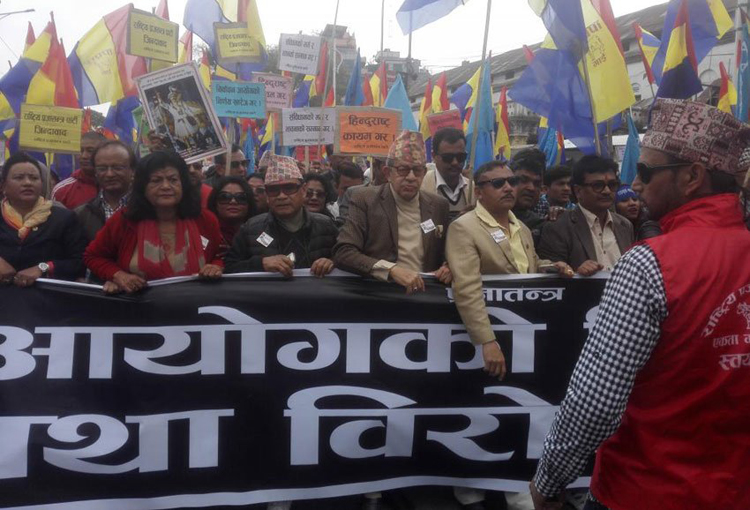 \"\" काठमाडौं, ७ चैत । निर्वाचन आयोगको कार्यालय घेराउ गर्न पुगेको सत्तारुढ दल राप्रपाका नेता/कार्यकर्ता र प्रहरीबीच सोमबार दिउँसो निकैबेर झडप भएको छ । काठमाडौंको शान्तिबाटिकाबाट कान्तिपथमा रहेको निर्बाचन आयोगको कार्यालयतर्फ अघि बढेका राप्रपाको कार्यकर्तालाई प्रहरीले रोकेपश्चात झडप भएको थियो । प्रहरीको घेरा तोडेर अघि बढ्न थालेपछि प्रहरीले अश्रुग्यास हानेको थियो । जवाफ राप्रपाको कार्यकर्ताहरुले ढुंगामुडा गरेका थिए । झडपमा राप्रपाका पूर्व अध्यक्ष पशुपतिशमशेर राणासहित थुप्रै नेता कार्यकर्ता घाइते भए भने प्रदर्शनकारीले हानेको ढुंगाले केही प्रहरीसमेत घाइते भए । \"\" निर्वाचन आयोगले राप्रपाको विधानबाट हिन्दु राष्ट्र र राजसंस्था हटाएको भन्दै राप्रपाले सोमवार काठमाडौंसहित देशैभर प्रदर्शन गरेको थियो । काठमाडौंको निर्वाचन आयोग कार्यालय घेराउ गर्न गएका प्रदर्शनकारीको नेतृत्व स्वयं उपप्रधानमन्त्री तथा स्थानीय विकासमन्त्री कमल थापाले गरेका थिए । प्रहरीको निषेधित क्षेत्र तोड्न खोज्दा प्रहरीले रोक्ने क्रममा प्रहरी र प्रदर्शनकारीबीच झडप भएको थियो । झडपपछि प्रहरीले हस्तक्षेप गरेको भन्दै राप्रपा कार्यकर्ताहरुले सडकमा टायरबालेर प्रदर्शन गरेका थिए । \"\" \"\" \"\" \"\" \"\" \"\" \"\"