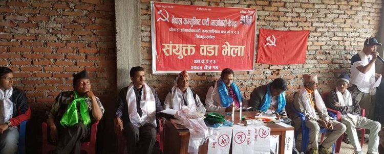 \"\"सिन्धुपाल्चोक, १४ चैत । नेकपा माओवादी केन्द्र बतासेको सयुक्त वडा भेला सम्पन्न भएको छ । तत्कालिन बतासे गाविस हाल चौतारा साँगाचोकगढी नगरपालिका २ नंम्बर वडाको भेलाले विष्णुप्रसाद सापकोटा ‘हरि’को अध्यक्षतामा २१ सदस्यीय वडा पार्टी कमिटि गठन भएको छ । त्यस्तै वडा नं ३ को भेलाले लनाम लामाको अध्यक्षमा २१ सदस्यीय गठन गरिएको माओवादी केन्द्रका नेता माधब सापकोटा ‘सुबोध’ले खबरडबलीलाई जानकारी दिए । पूर्वमन्त्री अग्निप्रसाद सापकोटाको प्रमुख आतिथ्यमा भएको कार्यक्रममा नेकपा एमाले परित्याग गरि परेबहादुर तामाङको नेतृत्वमा दुई दर्जन बढी माओवादी केन्द्रमा प्रवेश गरेको सुबोधले जानकारी दिए । [caption id=\"attachment_124673\" align=\"alignnone\" width=\"750\"]\"\" प्रवेशीहरूसँग फोटो खिचाउँदै सापकाेटा[/caption] पूर्वमन्त्री सापकोटाले सरकारले घोषणा गरेको आउँदो बैशाख ३१ गतेको स्थानीय चुनावमा लाग्न निर्देशनसमेत दिएका छन् । ‘अहिले देश माओवादीकै एजेण्डा अनुसार चलेको भन्दै सापकोटाले भने ‘परिर्वतनका विरोधिहरु अहिले माओवादी देखि आत्तिएका छन् ।’ त्यस्तै उक्त वडामा वाईसीएल, किसान, तामाङ, महिलालगायतका जनसंगठनहरूको वडा कमिटि गठन गरिएको छ ।