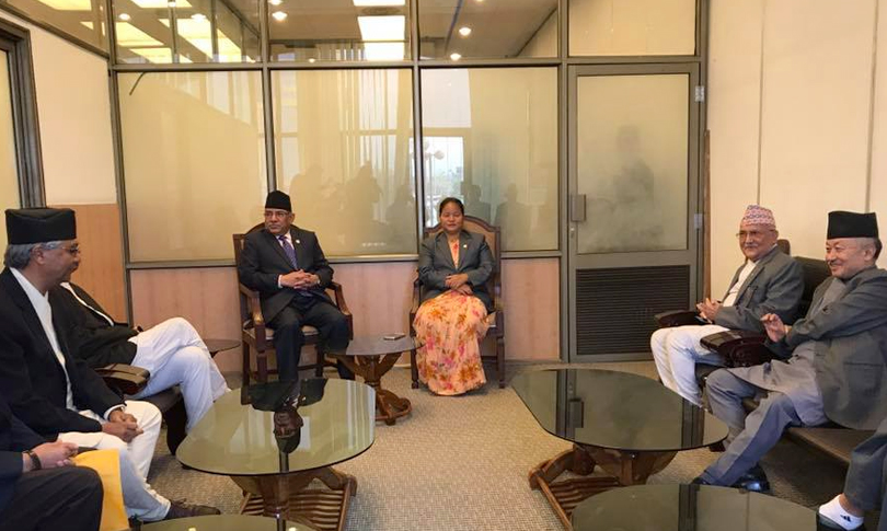 \"\"काठमाडौं, २२ बैशाख । व्यावस्थापिका संसद अवरुद्द गरिरहेको प्रमुख प्रतिपक्षि दल नेकपा एमालेलाई संसद खुलाउन सहमत गराउने उदेश्यले प्रमुख तिन दल बैठकमा जुटेका छन् । सत्तारुढ घटक नेकपा माओवादी केन्द्रका अध्यक्ष तथा प्रधानमन्त्री पूष्पकमल दाहाल प्रचण्ड, नेपाली कांग्रेसका सभापति शेर बहादुर देउवा र एमालेका अध्यक्ष केपी शर्मा ओली सभामुख ओनसरी घर्तिको कार्यकक्षमा बैठक बसिरहेका छन् । प्रधानन्यायाधीश सुशिला कार्कीविरुद्द दर्ता गरिएको महाअभियोग प्रस्ताव फिर्ता नलिएसम्म संसद चल्न नदिने अडानमा रहेको नेकपा एमालेले आफ्नो अडान छोडेको छैन । बैठकमा महाअभियोग, बजेट, दोस्रो चरणको निर्बाचन तथा संविधान संशोधनका बारेमा समेत छलफल हुने बताइएको छ ।