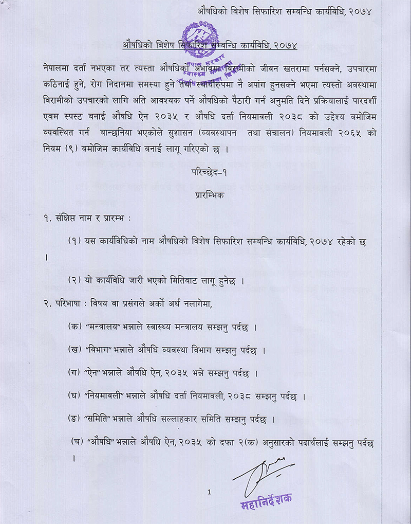 औषधिको विशेष सिफारिस सम्बन्धि कार्यविधि लागू