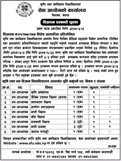\"\"काठमाडाैं । कृषि तथा वनविज्ञान विश्वद्यिालय सेवा अायाेगकाे कार्यालय चितवनले बिभिन्न नाै उप-प्राध्यापक पदमा दरखास्त अाव्हान गरेकाे छ ।  अावश्यक याेग्यता पुगेकाले ३५ दिन भित्र अावेदन  दिन सक्नेछन् ।