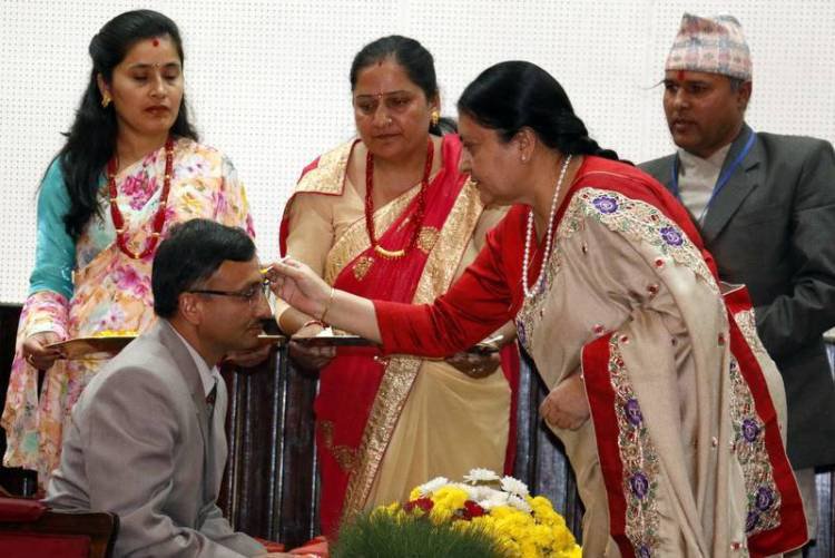 \"\"काठमाडौँ । राष्ट्रपति विद्यादेवी भण्डारीले आज विहान ११ बजेर ५१ मिनेटको शुभसाइतमा आफ्ना भाइ डेगेन्द्र पाण्डेलाई टीका लगाइन । राष्ट्रपति निवास शीतलनिवासमा भएको भाइटीकाको कार्यक्रममा राष्ट्रपति भण्डारीले टिका लगाएर भाइलाई आशिर्वाद दिँदै कटुुस, ओखर र मिठाइ खुवाएर भ्रातृवात्सल्य प्रस्तुत गरिन । भाई डेगेन्द्र पाण्डेले दक्षिणा प्रदान गरेर उनिसंग आशीर्वाद लिए ।
