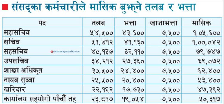 \"\"संसद् नै नहुँदा पनि यहाँ कार्यरत कर्मचारीले ८० प्रतिशतसम्म भत्ता लिँदै आएका छन् । यसबाहेक खाना–खाजाका लागि थप दैनिक २५० रुपैयाँ सुविधा उनीहरूले पाउने गरेका छन् । राज्यकोषबाट सचिवालयका कर्मचारीको भत्तामा मात्रै मासिक ७० लाख ५० हजारभन्दा बढी खर्च हुन्छ । गत २८ असोजदेखि संसद्को कार्यकाल सकिए पनि आगामी ७ माघसम्म कर्मचारीले तलबसहित भत्ता र खाना–खाजा खर्चलगायतका सुविधा पाउनेछन् । यस अवधिमा कर्मचारीको भत्तामा मात्रै दुई करोड १० लाखभन्दा बढी खर्च हुनेछ । अाजकाे नयाँ पत्रिकामा खवर छ संघीय संसदमा थप सुविधा संविधान जारी भएपछि रूपान्तरित संसद्को बैठक संविधानसभा जस्तो दिनरात बसेन । सचिवालयका कर्मचारी पनि फुर्सदिला भए । २८ असोजमा संसद्को कार्यकाल पनि सकियो । तर, सचिवालयका २२४ स्थायी कर्मचारीले ८० प्रतिशत भत्ता र दैनिक खाना–खाजालगायतका सुविधा भने लिदै आए । कति पाउँछन् संसद्का कर्मचारीले तलब र भत्ता ? आर्थिक वर्ष ०७३(७४ मा सरकारी कर्मचारीको तलब २५ प्रतिशतले बढेको हो । जसअनुसार मुख्य सचिवले मासिक ५४ हजार पाँच सय, सचिवले ५१ हजार ४१२, सहसचिवले ४० हजार १३७,उपसचिवले ३४ हजार २१२, शाखा अधिकृतले ३० हजार पाँच सय, नायब सुब्बाले २५ हजार पाँच सय, खरिदारले २२ हजार १६२ र कार्यालय सहयोगीले २३ हजार १७ रुपैयाँ तलब पाउने गरेका छन् । संसद् सचिवालयका महासचिवले मुख्यसचिवसरह र अन्य तहका कर्मचारीले निजामती कर्मचारीले पाउने बराबर नै तलब पाउँछन् । तर, ८० प्रतिशत भत्ता र दैनिक खाजाखर्चबापतको सुविधा जोड्दा निजामति कर्मचारीको भन्दा संसदका कर्मचारीले पाउने रकम दोब्बर बराबर हुन्छ । कति छन् संसद् सचिवालयमा कर्मचारी ? संघीय संसद् गठन हुनुअघिको व्यवस्थापिका संसद् सचिवालयमा कर्मचारी दरबन्दी ४३५ थियो । हाल २२४ स्थायी र करारसहित करिब तीन सय कर्मचारी कार्यरत छन् । अहिले संसद्मा एक महासचिव, दुईजना सचिव, ११ सहसचिव, ३४ उपसचिव, ४१ शाखा अधिकृत रहेको कर्मचारी प्रशासन शाखाका अधिकृत त्रिविक्रम पराजुलीले बताए । सचिवालयमा नायब सुब्बा ३० र २० जना खरिदार कार्यरत छन् । तीबाहेक मुद्रण अधिकृत, प्राविधिक अधिकृत, लेखा अधिकृत, प्राविधिक सहायक, कार्यालय सहयोगी गरी अन्य ८५ जना स्थायी कर्मचारी कार्यरत छन् । कर्मचारीको भत्तामा मात्रै मासिक ७० लाख खर्च सचिवालयमा हाल स्थायी र करार गरी करिब तीन सय कर्मचारी कार्यरत छन् । जसमध्ये २२४ स्थायी कर्मचारीले ८० प्रतिशत भत्ता पाउँछन् । महासचिवको मासिक भत्ता ५१ हजार एक सय छ । उनले तलबभत्तासहित मासिक एक लाख पाँच हजारभन्दा बढी रकम बुझ्ने गरेका छन् । दुई सचिवको मासिक भत्तामा मात्रै ९७ हजार २६०, ११ सहसचिवका लागि चार लाख ३५ हजार ७१०, ३४ उपसचिवका लागि ११ लाख ८५ हजार र ४१ 