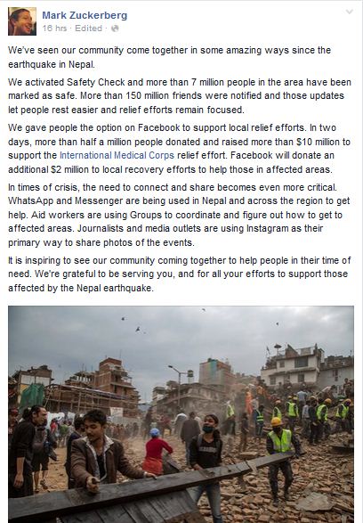 काठमाडौ, विश्वको चर्चित सामाजिक सञ्जाल फेसबुकका मालिक मार्क जुकर्बर्गले बैशाख १२ गते गोरखाको बारपाक केन्द्रविन्दु बनाएर गएको आम विनाशकारी महाभूकम्पबाट प्रभावितहरुलाई १ अर्ब २० करोड सहयोग गरेका छन् । उनले फेसबुकले यस्तो विपत्तको बेलामा नेपाललाई सक्ने सहयोग गरेको भन्दै  लेखेका छन्, ‘भुकम्प आइसके पछि लञ्च गरिएको सेफ्टी चेक टुल सात लाख भन्दा बढी मानिसहले प्रयोग गरे, र एक लाख ५० हजार बढी मानिसहरु निरन्तर अप्डेटमा रहे ।’ फेसबुकले १० लाख डलर ‘इन्टरनेसनल मेडिकल कर्पस’ मार्फत सहयोग गरेको र दूई लाख डलर अन्य उद्धारकार्यका लागि व्यवस्थापन गरेको बताएका छन् । उनले आफ्नो फेसबुक अकाउन्टमा नेपाललाई आवश्यक परेको बेलामा सहयोग गर्न सकेकोमा आफु र आफ्नो सँस्थाले गौरव महसुस गरेको बताएका छन् ।