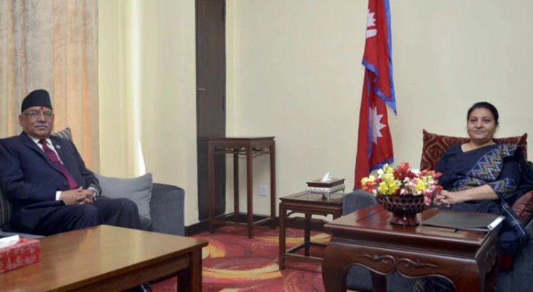 \"\"काठमाडौं । राष्ट्रपति विद्यादेवी भण्डारी र नेकपा माओवादी केन्द्रका अध्यक्ष प्रचण्डबीच बिहीबार बिहान भेटवार्ता भएको छ । भेटवार्ताका लागि प्रचण्ड बिहान ९ बजे शितल निवास पुगेका छन् । राष्ट्रियसभा गठन सम्वन्धी अध्यादेश दुई महिनादेखि रोकेको भन्दै आलोचना खेप्दै आएकी राष्ट्रपतिले राजनीतिक दलका शीर्ष नेताहरुसँग परामर्श गर्दै आएकी छन् । त्यसैको निरन्तरतास्वरुप प्रचण्डसँग फेरि पनि परामर्श गरेको बताइएको छ । राष्ट्रपति भण्डारीलाई छिटो अध्यादेश स्वीकृत गर्न सरकारको नेतृत्वकर्ता दल नेपाली कांग्रेसले दबाव दिँदै आएको छ । अध्यादेशमा एकल संक्रमणीय मत प्रणालीको व्यवस्था राखिएको भन्दै सबैभन्दा ठूलो दल एमालेले विरोध गर्दै आएको छ । कांग्रेस र एमालेबीचको अडानले राजनीतिक गाँठो नफुकिरहेका बेला माओवादी अध्यक्ष प्रचण्डले भने मध्यमार्गी विकल्पको खोजीमा रहेको बताउँदै आएका छन् ।