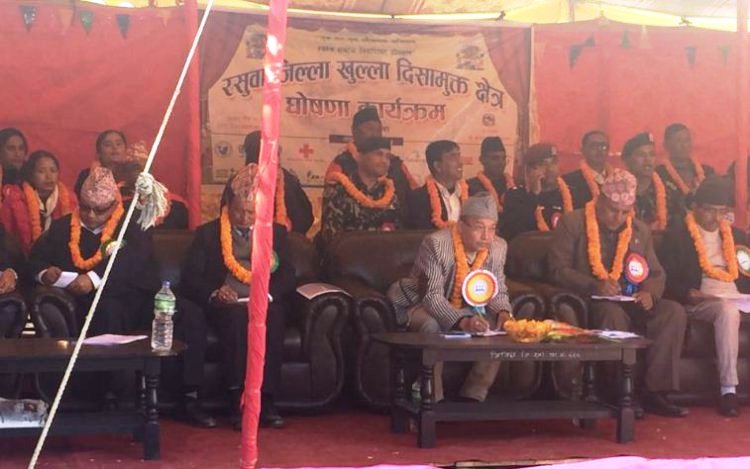 \"\"रसुवा।  जिल्लालाइ पूर्ण खुल्ला दिसामुक्त क्षेत्र घोषणा गरीएको छ । नेपाल सरकारको सन २०१७ सम्ममा मुलुकलाइ खुल्ला दिसामुक्त क्षेत्र घोषणा गर्ने अभियान अन्तरगत रसुवालाइ खुल्ला दिसामुक्त क्षेत्र घोषणा गरिएको हो । आइतबार सदरमुकाम धुन्चेमा जिल्ला खानेपानी, सरसफाइ तथा स्वच्छता समन्वय समितिले आयोजना गरेको खुल्ला दिसामुक्त क्षेत्र घोषणा सभामा सतप्रतिशत शौचालय निर्माण भएर प्रयोगमा आएसंगै जिल्लालाइ खुल्ला दिसामुक्त क्षेत्र घोषणा गरिएको हाे । जिल्लामा साढे दुइ बर्षमा ७८ प्रतिशत शौचालय निर्माण भएर कार्यान्वयनमा आएको समितिले जानकारी दिएको छ । तत्कालिन अवस्थामा १८ वटा गाविस रहेको जिल्लामा भुकम्प अगाडी ४ वटा गाविसलाइ खुल्ला दिसामुक्त क्षेत्र घोषणा गरिएको थियो भने ५ वटा गाविस घोषणाको अन्तिम चरणमा पुगेको थियो । महाभुकम्प पछिको कठिनाइका बाबजुत लक्षित समयमै खुल्ला दिसामुक्त क्षेत्र घोषणा गर्न सफल भएको समितिले जनाएको छ । जिल्लाका केहि शहरी इलाकामा सार्वजनिक शौचालय समेत निर्माण गरिएको छ । पर्याप्त मात्रामा सार्वजनिक शौचालय निर्माण नभइसकेको अवस्थामा चुनौतिकाबीच खुल्ला दिसामुक्त क्षेत्र घोषणा गरिएको हो । समितिले आवश्यकता अनुसार शौचालय निर्माण गर्दै घोषणा पुर्ण रुपमा कार्यान्वयन गर्ने जनाएको छ । घोषणा सभामा जिल्लालाइ खुल्ला दिसामुक्त बनाउने नेपाल सरकारको अभियानलाइ सहयोग गर्ने बिभिन्न गैर-सरकारी संघसस्था, जिल्लास्थित सरकारी कार्यालय, राजनितिक दल, पत्रकार लगायतलाइ कदर-पत्रले सम्मान गरिएको थियो ।