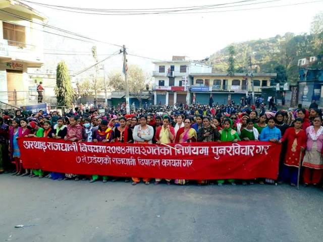 \"\"डोटी । डोटीका दीपायलमा प्रादेशिक राजधानीको माग गर्दै भएको विरोधमा प्रदर्शनकारी र प्रहरीबिच झडप हुँदा आधा दर्जन आन्दोलनकारी घाइते भएका छन । झडपमा परी कांग्रेस नेता घनश्याम पाठक लगायत अन्य पाँच जना घाईते भएका हुन् । घाइतेको राजपुरस्थित महाकाली पोलिकिल्निकमा उपचार भईरहेको छ । आन्दोलनकारीको कोणसभा सकिएसँगै आन्दोलनकारी मध्येका केहीले एकाएक प्रहरीलाई ढुंगा हानेपछि प्रहरी र आन्दोलनकारीबीच केही समय दोहोरो ढुंगा हानाहान भएको प्रत्यक्षदर्शीले बताएका छन् । झडपका कारण क्षेत्रीय सदरमुकाम दीपायल स्थिती राजपुर बजार तनाबग्रस्त बनेको छ । भने डोटीको जोरायलमा गरिएको बन्दका कारण सुदूरपश्चिमका ७ वटा जिल्लाको यातायात ठप्प भएको छ । साथै कैयौं यात्रु बीच बाटोमा अलपत्र परेका छन् ।