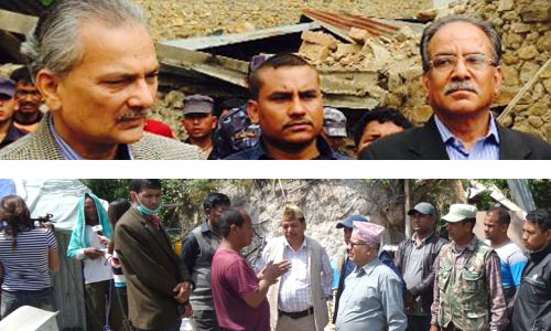 काठमाडौ, बैशाख १२ गतेको विनाशकारी भूकम्पले सुन्दर नेपालको चित्रलाई कुरुप र क्रुर मात्रै बनाएन सुन्दरबस्तीहरु लाई खण्डहर नै बनायो । हजारौँ नेपाली र केही विदेशी नागरिकको समेत ज्यान लियो । कैयौं मानिसलाई घरबारविहीन बनायो । कतिको कोख रित्यायो त कतिलाई टुहुरो बनायो । कतिले आफन्त गुमाए त कति आफै अंगभंग भए । सहरका ठूलठूला महलदेखि दुरदराजका झुपडीसम्म यो विपतिको शिकार भए । धेरै सांस्कृतिक सम्पदाहरु नष्ट गर्‍यो । कति धनमालको क्षती भयो भन्ने अहिलेसम्म हिसाब हुन सकेको छैन । भूकम्पले घरबास उडाए पछि कति मानिसहरु खुला आकाशमुनी दिनरात कटाइरहेका छन् । ओत लाग्ने पलास्टिकको पालसमेत पाइरहेका छैनन् । बस्ने बासस्थानसँगै बर्षौ देखि सुम्पेर राखेको धन सम्पतीमा समेत विपत्तिको आँखा लागे पछि मानिसहरु भोको पेट राज्यले उपलब्ध गराउने राहत आउने बाटो हेरेर बसिरहनुको विकल्प भेटिरहेका छैनन् । यस्तो बेलामा विभिन्न विदेशी मित्र राष्ट्रहरुबाट विपत व्यवस्थापनका लागि उद्धार टोली, भग्नावशेष पुनः निर्माणका लागि आर्थिक सहयोग तथा राहत लगायतका सामाग्री आइरहेको छ । तर पनि मुलुकका सबै भूकम्प प्रभावित स्थानहरुमा राज्यको उपस्थिती हुन सहिरहेको छैन । केही नेता र मन्त्रीहरु देशमा यत्रो ठूलो विपत परिरहेको बेला विदेश भ्रमणमा गइरहेका छन् । केही नेताहरु राजधानीमा मिटिङ् गर्नमा नै व्यस्त छन् । तर केहि राजनीतिक दलका नेताहरु यो भन्दा पनि माथि उठेर जनताको सेवा गर्न भुकम्प प्रभावित क्षेत्रहरुमा पुगेका छन् र जनताका घाउमा मलम–पट्टी पनि लगाइरहेका छन् । भूकम्प आएको दश दिनसम्म को नेताले कँहा के सहयोग गरे ? खबरडबली ले तयार पारेको एक रिर्पोटः भेटघाटमा व्यस्त प्रधानमन्त्री \"Sushial_Koirala_200\"महाभूकम्पका बेला नेपालमा नभएका प्रधानमन्त्री सुशील कोइराला स्वदेश फर्किए लगत्तै पार्टी, दलका नेता र कुटनीतिज्ञसँग भेटघाट गर्दै उद्दार राहतको विषयमा छलफलमा केन्द्रित छन् ।कोइरालको काम नै राहत र उद्दारका लागि समन्वय गर्दै तत्कालीन राहत प्याकेमा कसरी ल्याउने भन्नेमा केन्द्रित छन् । यसका लागि दाता राष्ट्र र संस्थासँग समन्वय गरिरहेका छन् । भूकम्पको चारदिनपछि राष्ट्रका नाममा सम्बोधन गरेका कोइराला भूकम्प पीडितलाई भेट्न सोमबार मात्र सबैभन्दा प्रभावित सिन्धुपाल्चोक पुग्न भ्याए । त्यहाँ पनि उनले पीडित समक्ष आफू बस्ने घरसमेत चर्किएको भन्दै उल्टै गुनासो गरे । राहतको लागि कुनै प्याकेज घोषणाभन्दा संकटको बेला सबैले धैर्यधारण गर्नुपर्ने उनको भनाई थियो । वस्तुस्थिति बुझ्दै राहत बाड्दै प्रचण्ड पुर्व प्रधानमन्त्री तथा एकीकृत नेकपा माओवादी अध्यक्ष प्रचण्ड बैशाख १२ गते आएको भूकम्पपछि प्रभावितहरुको स्थितिबारे 