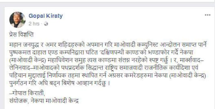 \"\"काठमाडौं । नेकपा एमाले र नेकपा माओवादी केन्द्रबीच पार्टी एकताको लिखित सहमति भएको भोलिपल्टै माओवादी नेता गोपाल किरातीले पार्टी एकताको बिरोध गरेका छन् । उनले पार्टी एकतामा नजाने नेताहरु नेकपा माओवादी केन्द्र महाधिवेशन समुह गठन गरेर महाधिवेशनमा जाने समेत बताएका छन् । आज एक विज्ञप्ति सार्वजानिक गर्दै नेता किरातीले जनयुद्ध शहिदहरुको अपमान हने गरि प्रचण्डले माओवादी आन्दोलनको बिघठन गरेको आरोप लगाएका छन् । ‘महान जनयुद्ध र अमर शहिदहरुको अपमान गरि माओवादी कम्युनिस्ट आन्दोलन समाप्त पार्ने पुष्पकमल दाहाल एण्ड कम्पनिद्वारा घटित ‘दक्षिणपन्थी काण्ड’को भण्डाफोर गर्दै नेकपा माओवादी केन्द्र महाधिवेशन समुह त्यस काण्डमा संलग्न नरहेको स्पष्ट गर्छु’, उनले भनेका छन् ‘मार्क्सवाद–लेनिनवाद–माओवादको पथप्रदर्शक सिद्धान्त राष्ट्रिय समाजवादी राजनीतिक कार्यदिशा एवं पहिचान मुद्दालाई निर्णायक तहमा स्थापित गर्न अग्रसर कमरेडहरुमा नेकपा माओवादी केन्द्र पुनर्गठन गरि अघि बढ्न बिशेष आव्हान गर्दछु ।’ नेता किरातीले सुरु देखिनै एकता प्रयासको बिरोध गदैृ आएका थिए ।\"\"