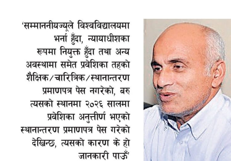 ‘सम्माननीयज्यूले विश्वविद्यालयमा भर्ना हुँदा, न्यायाधीशका रूपमा नियुक्त हुँदा तथा अन्य अवस्थामा समेत प्रवेशिका तहको शैक्षिक/चारित्रिक/स्थानान्तरण प्रमाणपत्र पेस नगरेको, बरु त्यसको स्थानमा २०२६ सालमा प्रवेशिका अनुत्तीर्ण भएको स्थानान्तरण प्रमाणपत्र पेस गरेको देखिन्छ,’ निवेदनमा भनिएको छ, ‘त्यसको कारण के हो जानकारी पाऊँ । साथै, उमेर खुलेको प्रवेशिका तहको परीक्षा उत्तीर्ण गरेको शैक्षिक/चारित्रिक/स्थानान्तरण प्रमाणपत्र पेस नगरी विश्वविद्यालयमा भएको भर्ना तथा न्यायाधीश पदमा पाएको नियुक्ति दूषित मानिन सक्छ । यस सम्बन्धमा नियम ४०(२) को खण्ड (घ) आवश्यक उपचारसहितको सूचना पाऊँ ।’