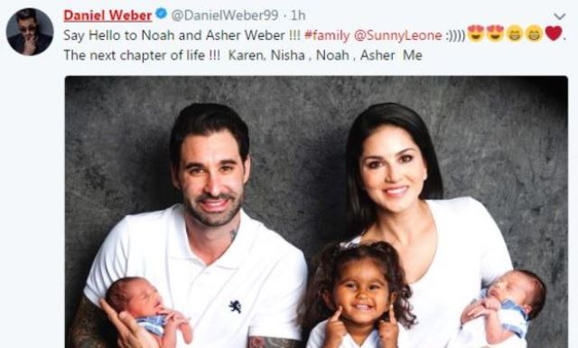 \"\"भारत । बलिउड अभिनेत्री सन्नी लियोनी जुम्ल्याहा बच्चाको आमा बनेकी छिन् ।सन्नीका पति डेनियलले जुम्ल्याहा बच्चा सहित परिवारको तस्विर ट्विटर मार्फत सार्वजनिक गरेपछि सोको खुलासा भएको हो । जुम्ल्याहा बच्चाको नाम अशर सिंह र नोहा सिंह वेबर रहेको छ । अघिल्लो वर्ष सन्नी र उनका पतिले निशा कौरलाई आफ्नो धर्मसन्तानको रुपमा राखेका थिए । जुम्ल्याहा बच्चा सन्नी आफैले जन्माएकी हुन् भन्ने विषयमा मिडियाले प्रश्न गरेको केही समयपछि सन्नीले बच्चा आफ्नै सन्तान रहेको बताएकी छिन् । उनले जुम्ल्याहा बच्चाबारे कोही भ्रममा नपर्न आग्रह गर्दै पुरा परिवार निर्माणका लागि केही वर्षअघिबाटै सरोगेसीको विकल्प लिएको बताइन् । \"\"