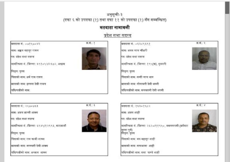 \"\"काठमाडाैं । निर्वाचन आयोगले प्रदेशसभा र प्रतिनिधिसभा सदस्यहरूको नामावली सार्वजनिक गरेको छ । फागुन २९ गते हुने राष्ट्रपति चुनावका लागि अायोगले प्रदेशसभा र प्रतिनिधिसभा सदस्यहरू सार्वजनिक गरेका हुन् । आयोगले सार्वजनिक गरेको सूचीमा प्रदेशसभाका ५४९ र प्रतिनिधिसभा तथा राष्ट्रियसभाका ३३१ सांसदको नाम सभावेश गरिएको छ । त्यस्तै मनाङबाट स्वतन्त्र उम्मेदवार भएर विजयी बनेका दीपक मनाङे भनिने राजीव गुरुङको भने मतदाता नामावलीमा नाम समावेश छैन । तर आत्मसमर्पण गरी पुर्पक्षका लागि थुनामा रहेका कैलाली-२ का सांसद रेशम चौधरीको नाम समावेश गरिएको छ ।