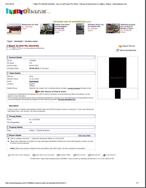 काठमाडौं । विदेशतिर युवती या युवकहरुले आफ्नो कुमारित्व लिलामीमा राखेको समाचार यदाकदा सुन्नमा आउँछ । तर नेपालमा भने एकजना युवाले आफ्नो सम्पूर्ण पहिचान नै लिलामीमा राखेका छन् । शिव नाम गरेका ती युवाले अनलाईनमा विज्ञापन राख्दै आफूलाई १० लाख रुपैयाँमा बिक्री गर्ने घोषणा गरेका हुन । [caption id=\"attachment_183635\" align=\"alignleft\" width=\"470\"]\"\" अनलाईनमा राखिएको बिज्ञापन[/caption] नेपालमा अनलाईन हाम्रोबजार डटकममा विज्ञापन गर्दै ती युवाले आफू को हो? के हो ? लगायतका सबै कुरा लिलामीमा राख्न खोजेको जनाएका छन् । उनले आफ्नो नागरिकता, पासपोर्ट, भिसालगायत सबै कुरा लिलामी गर्न खोजेको उल्लेख गरेका छन् र अप्रैल ९ तारिखमा विज्ञापन आइडी १३५३८९२ बाट पोष्ट गरेका ती युवा उक्त अनलाईनमा ११ जुन २०१६ देखि सदस्य रहेका छन् । उनको विज्ञापनमाथि एकजनाले कमेन्ट गरेको देखिन्छ । त्यसमाथि प्रत्युत्तर दिँदै ती युवाले आफूलाई अपरेशनका लागि पैसा चाहेको उल्लेख गरेका छन् । विज्ञापनमा सम्पर्कको माध्यम भने इमेल दिइएको छ ।