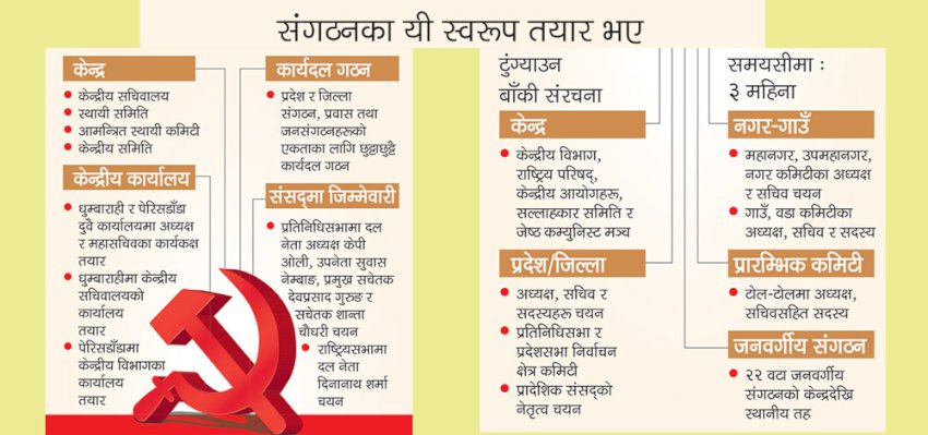 अब उसको ध्यान पार्टीका प्रदेश, जिल्ला हुँदै जनवर्गीय संगठनको एकतामा केन्द्रित भएको छ । त्यसका लागि १६ जेठमा अध्यक्षद्वय केपी ओली र पुष्पकमल दाहालको संयुक्त हस्ताक्षरसहित पार्टीका आन्तरिक कमिटीलाई सर्कुलर गरिसकिएको छ । ‘पार्टी एकताका आधारभूत कार्य सम्पन्न गर्न तीन महिनाको समयसीमा निर्धारण गरिएको छ’, अध्यक्षद्वयको आन्तरिक सर्कुलरमा छ । पार्टी कमिटी, प्रवास कमिटी र जनवर्गीय संगठनको एकता गर्न उसले छुट्टाछुट्टै कार्यदल गठन गरेको छ ।