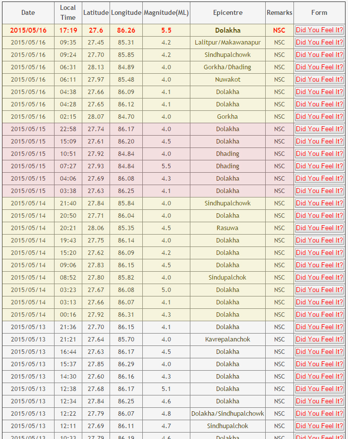काठमाडौं, विनाशकारी महाभूकम्प गएको ३ साता नाघ्न लागिसक्दा समेत दिनहुँ डरलाग्दा धक्काहरु आउने क्रम जारी नै रहेकाे छ । सरकारी सञ्चारमाध्यम, कतिपय विज्ञ र सरकारी अधिकारीहरु मिनेटैपिच्छेजसो आम जनतालाई निर्धक्क रहन अपिल गरिरहेका छन् । तर, अझै पनि भूकम्पको के–कस्तो जोखिमको के–कति सम्भावना बाँकी छ भन्नेबारे जनता ढुक्क हुन पाउनेगरी पटक्कै सूचना दिइरहेका छैनन् । राजधानीलाई घेरेर गोर्खादेखि दोलखासम्मलाई खतराको संकेत दिँदै नुवाकोट, काठमाडौं, ललितपुर, मकवानपुर, सिन्धुपाल्चोकलगायतका स्थानलाई केन्द्रविन्दु बनाएर  दिनदिनैजसो साढे ४ देखि साढे ५ म्गाग्निच्युडसम्मका भूकम्पका धक्का दिनहुँ आधा दर्जनको संख्यामा कायम छन् । यो स्थितिमा प्रभावित क्षेत्रका घर–कोठा सग्लै भएका समेत धेरैजसो जनता त्रसित भई घर र डेरा छाडेर प्लास्टिकको ओतमुनि खुला चौर, सडक र खेतबारीमा रात बिताइरहेका छन् । घर क्षतिग्रस्त भएका वा पूर्णतः भग्नावशेषमै परिणत भइसकेकाहरुको त झन् बेहाल छँदै छ । यस्तो संवेदनशील अवस्थामा अबको सम्भावना के हो, यो समयमा के–कसरी र के–कस्ता सजगता अपनाउनुपर्ने हो, कुन–कुन स्थानका र के–कस्ता संरचनामा बस्न मिल्ने हो वा नमिल्ने हो भन्नेजस्ता प्रश्नबारे जिम्मेवार निकायहरुले जनता आश्वस्त हुनेगरी कुनै भरपर्दो सल्लाह, सुझाव र ढाडस पटक्कै दिइरहेका छैनन् । एकापसमै परस्पर विरोधीजस्ता लाग्ने, अमूर्त र गोलमटोलका बहस, तर्कवितर्क र प्रचारवाजीले जनतामा झनै चर्को अन्योलता सिर्जना गरिरहेको छ । के–कस्तो छ त अझै भूकम्पको जोखिम ? यतिबेला भूकम्पको जोखिम कस्तो छ भन्नेबारे न त कुनै सरकारी निकाय र अधिकारीले स्पष्टताका साथ जनतालाई सुसूचित गर्न सकेका छन्, न कुनै विज्ञ–विशेषज्ञले । न त कुनै राष्ट्रिय संघ–संस्थाले जनतालाई ढुक्क र निर्धक्क तुल्याउनेगरी सोझो परामर्श दिइरहेका छन्, न त कुनै अन्तर्राष्ट्रिय निकाय या संघ–संस्थाले नै यो काम गरिरहेका छन् । जनतालाई सुसूचित पार्ने प्रयास गरेजस्तो देखिए तापनि अहिले चौतर्फी अन्योल, भय र त्रास सिर्जना गर्नेगरी अपवाहहरुको बाढी मात्रै चलाएका छन् सबैले । शुक्रबार र शनिबार गएका भूकम्पको सरकारी आँकडा मात्रै हेर्दा पनि स्थिति अझै पनि भयावह देखिएको छ । शनिबार मात्रै पनि विभिन्न स्थानमा केन्द्रविन्दु बनाएर साँझ साढे ५ बजेअघिसम्म ४ म्याग्निच्युडमाथिका ८ वटा भूकम्प आइसकेका छन् । राष्ट्रिय भूकम्प मापन केन्द्रका अनुसार बिहान ६ बजेदेखि साँझ साढे पाँच बजेसम्ममा राजधानी वरिपरि मध्यनेपालमा केन्द्रित भई ८ पटक भूकम्प आएका हुन् । बिहान २ बजेर १५ मिनेटमा गोरखालाई केन्द्रविन्दु बनाएर ४ म्याग्निच्युडको भूकम्प आयो । त्यसलगत्तै ४ बजेर २८ मिनेटमा 