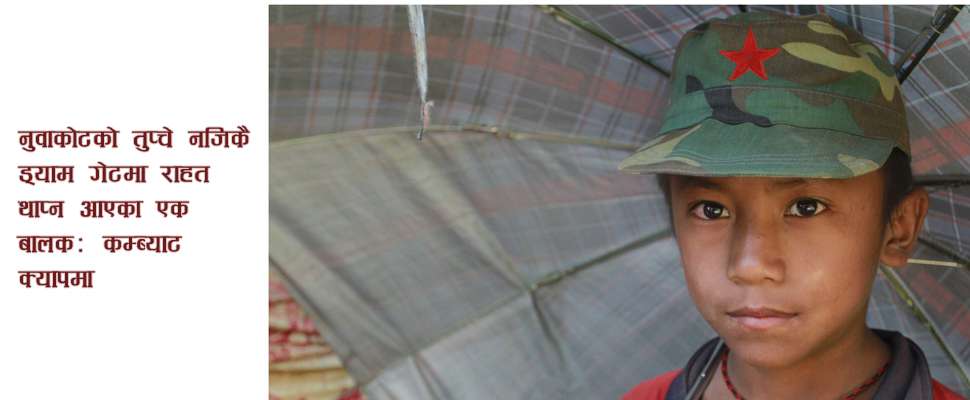 यि बालकको नाम सोम तामाङ हो । नुवाकोट तुप्चेका सो छाता ओढेर राहतको पखाईमा थिए । तुप्चेको ड्याम गेटमा आयोजित राहत वितरणमा आइपुगेका यि बालकको कोही आफन्त पुर्व जनसेनामा हुनुपर्छ । उनले आफ्नो घर पुर्ण रुपमा भत्किएको बताए । बाआमा राहत लिन आउन नसक्ने बताएका उनलाई कम्ब्याट क्याप सारै मनपर्छ रे । क्यापको पनि अझ स्टार । भन्नचाही भनेनन् तर उनका आफन्त कोही पूर्व जनसेनाका सदस्य हुनुपर्छ । क्याप आफुले सधैं लगाउने गरेको बताए । जे होस् तात्कालिन माओवादी चलाएको १० वर्षे जनयुद्धको असर र प्रभाव कहिल्यै मेटिदैन । तस्विरः खबरडबली