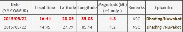 काठमाडौं, शुक्रबार भूकम्पका दुई धक्का महसुस गरिएको छ । राष्ट्रिय भूकम्प मापन केन्द्रले धादिङ र नुवाकोटमा दुई घण्टाको अन्तरमा भूकम्पका दुई धक्का मापन गरिएको छ । पहिलो धक्का दिउँसो दुई बजेर ४५ मिनेटमा ४.२ म्याग्निच्युड र अर्को धक्का बेलुकी ४ बजेर ४४ मिनेटमा भूकम्प मापन गरिएको छ । भूकम्पका धक्कामा क्रमशः कमी हुँदै आएको छ ।