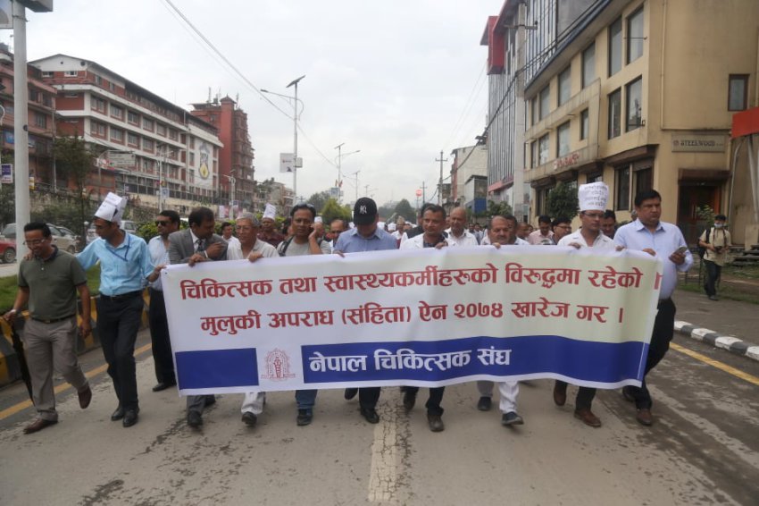 काठमाडौं ।   नेपाल चिकित्सक संघको आह्वानमा चिकित्सकहरुले आइतबार देशभरका स्वास्थ्य संस्थामा आकस्मिकबाहेक सबै सेवा बन्द गरेर सडकमा उत्रिएका छन् । भदौ १ देखि लागू भएका मुलुकी देवानी र अपराध संहितामा गरिएको व्यवस्था खारेजीको माग गर्दै काठमाडौंको माइतीघरबाट सुरु भएको चिकित्सकहरुको जुलुस नयाँ बानेश्वर पुगेर कोणसभामा परिणत भएको थियो । बिरामीको ज्यान बचाउने सफा नियतले आफूले भ्याएसम्म उपचार गर्दा केही अनपेक्षित घटना भए चिकित्सकलाई ज्यानमारासरह व्यवहार गर्ने कानुन संशोधन गर्न माग गर्दै उनीहरूले संगठित विरोध सुरु गरेका हुन् । कोणसभामा बोल्दै डा. गोविन्द केसी, डा. हरिहर वस्ती, डा.केदारनरसिंह केसी, मुक्तिराम श्रेष्ठ, लगायतले चिकित्सकको मनोवल गिराउने खालको व्यवस्था सच्याउन आग्रह समेत गरेका छन् । नेपाल चिकित्सक संघको आह्वानमा उनीहरूले आइतबार नै मेडिकल काउन्सिलमा लाइसेन्ससमेत जम्मा गर्ने घोषणा गरेका छन् । आफ्ना मागप्रति सरकार संवेदनशील नभए शुक्रबारदेखि अनिश्चितकालीन रूपमा स्वास्थ्य सेवा ठप्प पार्ने चेतावनी संघले दिएको छ ।