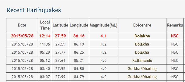 काठमाडौं, बिहिबार भूकम्पका ६ धक्का महसुस गरिएको छ । राष्ट्रिय भूकम्प मापन केन्द्रका अनुसार बिहिबार बिहान गोरखा/धादिङ केन्द्रबिन्दु बनाएर ३ बजेर ७ मिनेट र ३ बजे ४० मिनेटमा ४ म्याग्निच्युड भूकम्प मापन गरिएको छ भने त्यसको करिब दुई घण्टा पछि ५ बजेर १२ मिनेटमा काठमाडौं केन्द्रबिन्दु बनाएर ४ म्याग्निच्युडको धक्का महसुस गरिएको थियो भने त्यसको १७ मिनेट पछि नै ५ बजेर २९ मिनेट जाँदा दोलखा केन्द्रबिन्दु बनाएर ४.२ म्याग्निच्युडको पराकम्प मापन गरेको छ । यसका साथै ११ बजेर ३६ मिनेट जाँदा दोलखा केन्द्रबिन्दु बनाएर ४.२ म्याग्नेच्युडको भूकम्प मापन गरेको छ भने १२ बजेर १४ मिनेट जाँदा दोलखा नै केन्द्रबिन्दु पारेर ४.१ म्याग्नेच्युडको धक्का महसुस गरेको छ ।