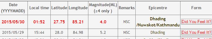 काठमाडौं, शनिबार मध्येराती पुन पराकम्प भएको छ । राष्ट्रिय भूकम्प मापन केन्द्रका अनुसार राती १ बजेर ५२ मिनेट जाँदा पराकम्प भएको हो । नुवाकोट धादिङ र काठमाडौंलाई केन्द्र बनाएर ४ रेक्टर स्केलको पराकम्प भएको भकम्प मापन  केन्द्रले जनाएको छ । यस अघि शुक्रबार दिउसो तीन बजेर ४४ मिनेट जाँदा  धादिङलाई केन्द्र बनाए ५.२ रेक्टरको शक्तिसाली पराकम्प भएको थियो ।