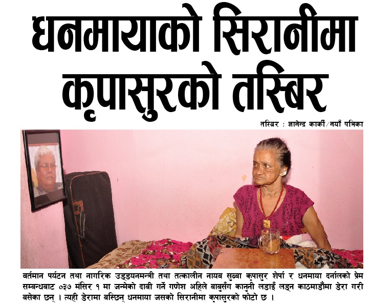 काठमाडौं,  वर्तमान पर्यटन तथा नागरिक उड्डयनमन्त्री तथा तत्कालीन नायब सुब्बा कृपासुर शेर्पासँग प्रेममा परेर छोरासमेत जन्माएको बताउने धनमाया दर्नाल अहिले अर्धचेत अवस्थामा छिन् । छोरा स्वीकार गर्न भन्दै उनले कृपासुरसँग ३५ वर्षसम्म रोइकराइ गरिन्, तर मानसिक पीडा र शारीरिक रोगले थलिएकी उनी अहिले न रुन सक्छिन् न हाँस्न । दुवै हातका औँला नभएकाले खान कठिन छ, उठ्न नसक्ने भएकाले दिसा–पिसाब पनि ओछ्यानमै बसेर गर्नुपर्छ । आजको नयाँ पत्रिका दैनिकमा खबर छ–भोजपुरका कृपासुर नायब सुब्बाका रूपमा ताप्लेजुङ सदरमुकाम फुङलिङ गएका वेला स्थानीय दलित महिला धनमायासँग प्रेममा परेका थिए । उनीहरूको सम्बन्धबाट ०३७ मंसिर १ मा जन्मेको दाबी गर्ने गणेश अहिले बाबुसँग कानुनी लडाइँ लड्न काठमाडौंमा डेरा गरी बसेका छन् । त्यही डेरामा बस्छिन् धनमाया जसको सिरानीमा कृपासुरको फोटो छ । बिरामी धनमाया राम्ररी बोल्न पनि सक्दिनन् । सासैसासमा उनले भनिन्, ‘म कृपासुरकी स्वास्नी हुँ । गणेश हाम्रो छोरा हो । म मर्ने वेला भएको छ । छोराको नागरिकता आउला भनेर अदालत पनि गएँ । मसँगै छोराले पनि दुस्ख पायो, छोराको अनुहारमा हाँसो देखेर मर्ने मन छ ।’ छोरा जन्मिएपछि कृपासुर ताप्लेजुङबाट हिँडे, सामाजिक अपहेलना र आर्थिक अभाव सहेर दलित महिलाले ‘विनाबाबुको’ छोरा गणेशलाई हुर्काइन् । गणेशले कृपासुरसँग बाबुछोराको नाता स्थापित गर्न डिएनए टेस्ट गर्ने प्रस्ताव राख्दै आएका छन् । धनमायालाई त्यो प्राविधिक जानकारी छैन, उनी भन्छिन्, ‘जे गर्नु छ चाँडै गर्नुपर्‍यो, म मरेँ भने छोरा–नातिले झन् दुस्ख पाउँछन् ।’ गणेशकी पत्नी सुजाता भित्रिकोटी ९शेर्पा०का अनुसार धनमायालाई कलेजोसम्बन्धी रोग र डाइबिटिज छ, ताप्लेजुङमै रहँदा घरमै एकपटक लडेकी थिइन्, त्यही कारण उब्जिएको नसासम्बन्धी समस्याले पनि वेलावेला दुस्ख दिन्छ । ताप्लेजुङमै रहँदा १७–१८ वर्षपहिले ढिकीले दुवै हात किचेको रहेछ । पहिला गाउँमै गोबर लगाउनेलगायतका घरेलु उपचार गरिएको रहेछ । डेढ महिनापछि डाक्टरकहाँ जादा टिटानस अन्तिम अवस्थामा पुगेको देखिएछ । त्यसैले दुवै हातका सबै औँला काट्नुपरेको रहेछ ।