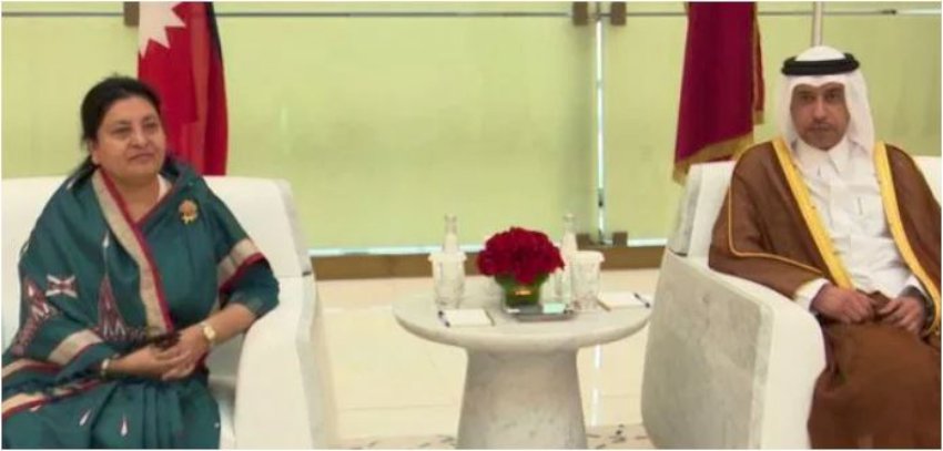काठमाडौं । कतार भ्रमणमा रहेका राष्ट्रपति विद्यादेवी भण्डारीले मंगलबार कतारका राष्ट्राध्यक्ष (अमिर) शेखर तमिम विन हमान अल थानीसँग द्विपक्षीय वार्ता गरेकी छिन् । अाजकाे नयाँ पत्रिका  दैनपकमा याे खबर छ - वार्तापछि नेपाली सरकारी राहदानी वाहकलाई कतारमा प्रवेशाज्ञा नलाग्ने तथा कृषि र खाद्य सुरक्षामा सहकार्यसम्बन्धी दुई समझदारीपत्रमा दुवै देशबीच हस्ताक्षर भएको छ । कतारका अमिरको दरबारमा भएको भेटवार्तामा द्विपक्षीय सहकार्य अभिवृद्धि गर्ने विषयमा छलफल भएको कतारका लागि नेपाली राजदूत रमेश कोइरालाले टेलिफोनमा जानकारी दिए ।