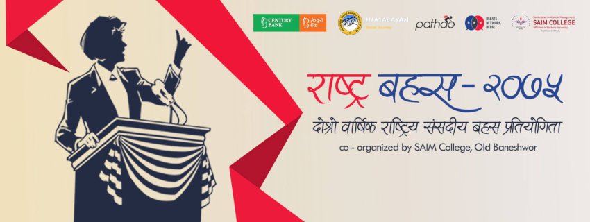 काठमाडाैं । राजधानीमा राष्ट्र बहस २०७५ आयोजना हुने भएको छ । पुरानो बानेश्वरस्थित साइम कलेज (Saim College)मा आउँदो कार्तिक ३० देखि मंसीर २ गतेसम्म चार दिनसम्म चल्नेछ । चार दिनको कार्यक्रम अवधिमा बेलायती संसदीय प्रणालीमा घनिभुत तालिम र बहसहरु हुने कार्यक्रम संयोजक पदम रेग्मीले बताए । नेपाली भाषमा तर्कसंगत बहस वैचाकिर वादविवादको लागि उचित मञ्च प्रदान गर्ने उद्देश्यका साथ विगत ४ वर्षदेखि निरन्तर रुपमा “राष्ट्र बहस” प्रतियोगिता सञ्चालन हुँदै आएको छ । प्रतियोगिताको मुख्य लक्ष्य समावेशिताको सिद्धान्त अनुरुप आफ्ना विचारहरु नेपाली भाषामा व्यक्त गर्न सकिने स्थानको निर्माण गर्नु हो । यस प्रतिक्रियाको आयोजना Debate Network Nepal (DNN) ले आयोजना गर्दैछ । सो प्रतिक्रियामा अधिकतम टोली संख्या ४० जनासम्म हुनुपर्ने र बहसकर्ताको संख्या प्रति टोली २ जना हुने नियम रहेको छ साथैसहभागि समूहलाई कार्तिक ३० गते तालिम दिइनेछ । त्यस्तैगरीमंसीर १ र २ गते समूह चरण छनोट गरिने छ भने मंसीर ३ गते नकआउट चरण हुनुका साथै मंसीर ३ गतेनै प्रतियोगिताको फाइनल हुने समेत आयोजक संस्थाले बताएको छ । नेपाली समाजमा बहसको संस्कृतिलाई प्रोत्साहन गर्नको लागि स्तरिय बहसकर्तानिणार्यक र प्रशिक्षकहरुको निर्माण गर्ने र लोकतान्त्रिक विचारधाराको एक मुल मान्यताको रुपमा रहेको वैचारिक स्वतन्त्रतालाई उत्सवको रुपमा मनाउन हातेमालो गर्ने अभिलाषा यो कार्यक्रमले बोकेको छ । बेलायती संसदीय प्रणाली अन्तर्गत प्रत्यक बहस एक घण्टा समयावधिको हुन्छ जसमा चार दुई सदस्यीय टोली हुन्छन्जसलाई सरकार र प्रतिपक्ष गरि दुई भागमा बाँडिन्छन् र उनिहरुले दिइएको विषयमा क्रमशः पक्ष र प्रतिपक्षमा बहस गर्छन् ।