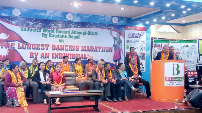 काठमाडौं। यसअघि भारतकी कमला मण्डल हेमथलाले १२३ घण्टा लगातार नाचेर कायम गरेको बिश्व रेकर्डलाई तोड्दै लगातार १२६ घण्टा लोक नृत्य प्रस्तुत गरेर १७ वर्षीय नेपाली चेली बन्दना नेपालले नयाँ विश्व कीर्तिमान कायम गरेकी छन् । बन्दना नेपालले मंसिर ७ गतेबाट ५ रात ६ दिन आज दिउँसो ३ बजेसम्म निरन्तर नृत्य गर्दै १२६ घण्टाको बिश्व कीर्तिमानसँगै ‘गिनिज बुक अफ वल्र्ड रेकर्ड’मा बन्दना नेपालले सबैभन्दा लामो समयसम्म नृत्य गर्ने महिलाको पहिचान बनाएकोमा हार्दिक बधाई तथा निरन्तर सफलताको शुभकामना व्यक्त गरेका छन्