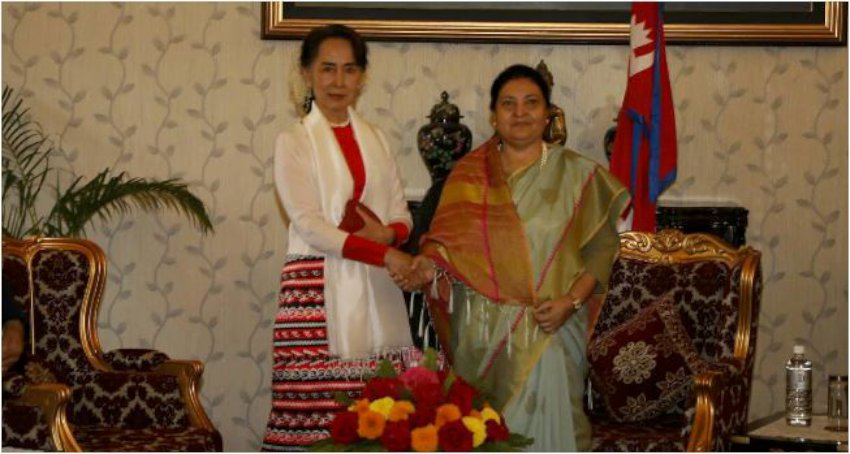 काठमाडौँ। राष्ट्रपति विद्यादेवी भण्डारीसँग नेपालको औपचारिक भ्रमणमा रहनुभएका म्यान्माका स्टेट काउन्सिलर आङ सान सु कीले भेटवार्ता गरेका छन् । राष्ट्रपति कार्यालय शीतल निवासमा आज बिहान भएको सो भेटमा द्विपक्षीय आपसी हितका विविध विषयमा कुराकानी भएको थियो । भेटवार्तामा राष्ट्रपति कार्यालय एवं परराष्ट्र मन्त्रालयका उच्च अधिकृतको सहभागिता रहेको थियो । एशिया प्रशान्त शिखर सम्मेलनमा भाग लिने सिलसिलामा प्रधानमन्त्री केपी शर्मा ओलीको निमन्त्रणामा नेपालको औपचारिक भ्रमणका लागि काउन्सिलर सु की बिहीबार बिहान काठमाडौँ आएको हो । सो सम्मेलन आगामी शनिबार आयोजना हुँदैछ ।