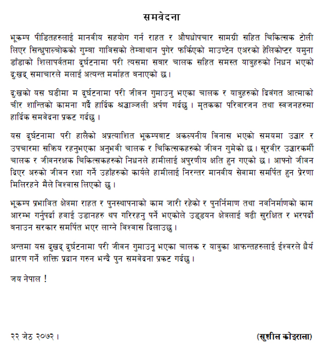 काठमाडौं, प्रधानमन्त्री सुशील कोइरालाले माउन्टेन एअरको हेलिकप्टर दुर्घटनामा परी जीवन गुमाएका स्वदेशी तथा विदेशी नागरिकहरुप्रति श्रद्धाञ्जली अर्पण गर्दै उनीहरुका स्वजनहरुप्रति हार्दिक समवेदना प्रकट गरेका छन् । प्रधानमन्त्री कोइरालाले अकल्पनीय र विनाशकारी भूकम्पको पीडामा छट्पटिएका नेपालीहरुलाई राहत  र स्वास्थोपचार सेवा दिने मिसनमा खटिएको टोली दुर्घटनामा परेको खबरले आफू मर्माहत भएको बताएका छन् । उनले नेपाललाई यस दुःख र कठिनाइको समयमा सघाउन आएको रिपोर्टर्स सान फ्रन्टियर्स (डक्टर्स विथआउट बोर्डर्स) लाई हुन गएको मानवीय क्षतिप्रति दुःख प्रकट गरेका छन् । गत वैशाख १२ र २९ गतेको भूकम्प र तिनका पराकम्पनमा परी आफन्त गुमाएका, घाइते भएका र घरबार भत्केर आश्रयविहीन भएका पीडितहरुलाई राहत र स्वास्थ्योपचार सेवा पु¥याउने उद्देश्यले स्वास्थ्यकर्मीको टोली र औषधिसहित सो हेलिकप्टर सिन्धुपाल्चोक क्षेत्र नं २ को गुम्बा गाविसको तेम्बाथान पुगेर फर्किएको थियो । सो हेलिकोप्टरका चालक सुवेग श्रेष्ठ, डा. सन्दीप महत, शेरबहादुर कार्की र रिपोर्टर्स सान फ्रन्टियर्स (डक्टर्स विथआउट बोर्डर्स) की डच महिला जेनिचको दुर्घटनामा दुःखद् निधन भएको छ । हेलिकप्टर विद्युतको प्रशासरण लाइनमा ठोकिएर दुर्घटनाग्रस्त भएको थियो । सरकारले संस्कृति, पर्यटन तथा नागरिक उड्डयन मन्न्त्रालयका सहसचिव बुद्धिसागर लामिछानेको अध्यक्षतामा श्री एअरलाइन्सका वरिष्ठ पाइलट प्रमोद लामा र मनाङ एअरका इञ्जिनियर जनक थापा तथा मन्त्रालयका उपसचिव प्रमोद नेपाल सदस्य सचिव रहेको छानबिन टोली समेत बनाएको छ ।