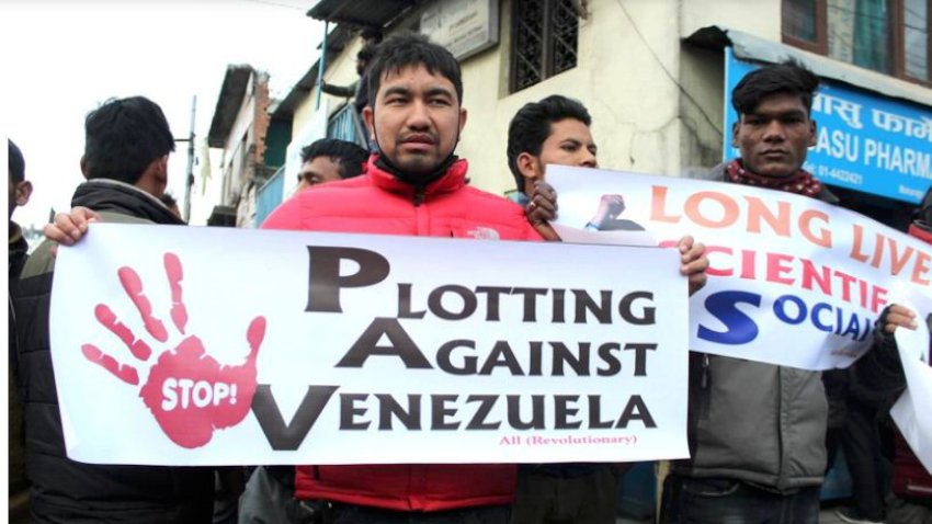 काठमाडौं । भेनेजुयलामा अमेरिकी हस्तक्षेपको विरोध गर्दै काठमाडौंस्थित अमेरिकी दूतावास अगाडि नेत्रविक्रम चन्द ‘विप्लव’ नेतृत्वको नेकपाले धर्ना दिइएको छ ।  नेत्रविक्रम चन्द ‘विप्लव’ नेतृत्वको नेकपाले निर्वाचित सरकारलाई अपदस्थ हुनेगरी अमेरिकाले हस्तक्षेप गरेको भन्दै विरोध प्रर्दशन गरेको हो । प्रदर्शनकारीहरुले तत्काल भेनेजुयलामाथिको हस्तक्षेप बन्द गर्न पनि अमेरिकासँग माग गरेका छन् । भेनेजुयलाको स्वाधिनतामाथि हस्तक्षेप गरेकाले अमेरिकाविरुद्ध प्रर्दशन गर्नुपरेको विप्लव नेतृत्वको पार्टीको भनाई छ । कार्यक्रममा नेकपाका जवस मोर्चासहितका नेता तथा कार्यकर्ताको सहभागिता रहेको थियो ।