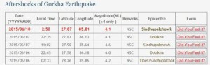 \"jjjjjjjjj-640\" काठमाडौं, १२ वैशाखको भूकम्पपछि निरन्तर आएको पराकम्पन दुई दिन रोकिंदै पुनः आएको छ । सोमबार र मंगलबार कुनै ४ रेक्टरस्केलमाथिका पराकम्पन नगए पनि बुधबार बिहानै भूकम्पको पराकम्पन गएको राष्ट्रिय भूकम्प मापन केन्द्रले जनाएको छ । आज बिहान २ बजेर ५० मिनेटमा सिन्धुपाल्चोकलाई केन्द्र बनाएर ४.१ रेक्टरस्केलको पराकम्पन गएको हो । दुई दिन खाली भए पनि अरु दिनमा १२ वैशाखपछि निरन्तर भूकम्पका ४ रेक्टरस्केलका माथिका पराकम्पन गरहेका छन् ।
