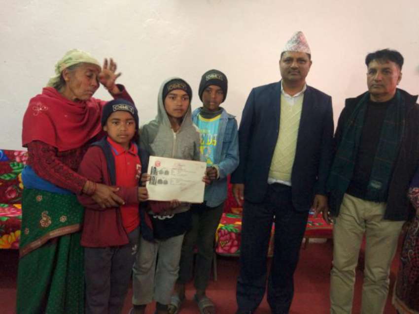 पर्वत । बाबुको मृत्युपछि आफ्ना नाबालक छोराछोरीलाई छाडेर आमाले नै दोस्रो विवाह गर्दा बिचल्लीमा परेका यहाँका तीन बालकलाई पाँच आना घडेरी प्रदान गरिएको छ । पर्वतका प्रमुख जिल्ला अधिकारी गुरुदत्त ढकालले तीन बालकलाई विभिन्न सहयोगी खोजेर घडेरी पास गरिदिएका हुन् । बालक विचल्ली भएको समाचार गत पुस १९ गते राष्ट्रिय समाचार समितिमा प्रकाशन भएपछि प्रमुख जिल्ला अधिकारी ढकालको पहलमा ती बालकले जग्गा पाएका हुन् । बाबुको मृत्युपछि आमाले दोस्रो बिहे गर्दा बिचल्लीमा परेका पर्वत कुश्मा नगरपालिका– ९ कटुवाचौपारीका तीन दलित समुदायका बालकले रु पाँच लाख मूल्य पर्ने पाँच आना घडेरी पाएको हो । बाबु आमा नहुँदा सहाराविहीन भएका विशाल परियार, विवेक दर्जी र विश्वास परियारलाई सोमबार जिल्ला प्रशासन कार्यालयमा लालपूर्जा हस्तान्तरण गरिएको छ । तीन बालककोे बिचल्ली देखेपछि उनीहरुलाई स्थायी बसोवास र शिक्षा दिने कुरामा पहल गर्ने रुचि जागेर आएको प्रजिअ ढकालले बताए । ‘शान्तिसुरक्षा कायम गर्ने र दैनिक प्रशासनिक काम गर्ने भए पनि असहाय, हिंसापीडित र निमुखाहरुका लागि केही गर्नुपर्छ भन्ने भावनाले यो पहल गरेको हुँ’ जग्गाको लालपूर्जा हस्तान्तरण कार्यक्रममा प्रजिअ ढकालले भने, \'अब उनीहरुका लागि आवास बनाउन पहल गर्छु ।\' प्रजिअ ढकालको पहलमा तत्कालीन जिल्ला विकास समितिका उपसभापति राम शर्मा पौडेलले जम्मा रु एक लाख लिएर रु पाँच लाख भन्दा बढीको घडेरी पास गरिदिएका छन् । घडेरी किन्नका लागि प्राविधिक क्षेत्रमा काम गर्ने २४ जना युवाले रु एक लाख सङ्कलन गरेका थिए । इञ्जिनीयर सुरेन्द्र गौतमको नेतृत्वमा सङ्कलित उक्त रकम गौतम, सरोज ढकाल र ईन्द्रबहादुर राना थापाले बालबालिकालाई हस्तान्तरण गरिएपछि जग्गाधनीलाई बुझाइएको छ । विसं ०७४ मङ्सिरमा मृत्यु भएका पर्वतको कुश्मा नगरपालिका–९ कटुवाचौपारीस्थित छेउखन्नाका धनबहादुर दमैका तीन छोरा बिचल्लीमा परेका थिए । उनका दुई श्रीमतीमध्ये सावित्री दमै चार वर्षअघि र कान्छी देवी परियार दुई वर्षअघि दोस्रो विवाह गरी गइसकेका छन् । देवीतर्फका छोरा विवेक र सावित्रीतर्फ विशाल र विश्वास बाबुको मृत्युपछि सहारा विहीन बनेका थिए । उनीहरु वृद्ध हजुरबुबा हजुरआमाको साथमा जीवनयापन गर्दै आएका छन् । जग्गाको लालपूर्जा लिँदा खुशीले रोएकी हजुरआमा गौतमी परियारले अब टुहुराले सहारा पाएको बताए । \'मैले रुदै ज्याला मजदूरी गरेर पाल्न सकेकी थिइन,\'उनले भनिन् \'अब यी बालकको पनि भविष्य बन्छ भन्ने सोचेकी छु ।\' प्रजिअ ढकालको पहलमा जेठबाट बालकको हेरचाह, पालनपोषण र शिक्षाका लागि मासिक रु ६ हजार परिवारले पाउन थालेका छन् । वडाको सिफारिसमा प्रमुख जिल्ला अधिकारी ढकालले एसओएस सामाजिक से