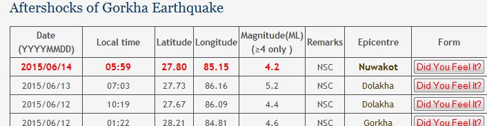 \"Nuwakot\"काठमाडाैं, काठमाडौं नजिक केन्द्र बनाए भर्खरै भूकम्पको झड्का गएको छ । बिहान ५ बजे ५९ मिनेट जाँदा नुवाकोटलाई केन्द्र बनाएर ४.२ रेक्टरस्कलेको पराकम्पन गएको राष्ट्रिय भूकम्प मापन केन्द्रले जनाएको छ । हिजो दोलखालाई केन्द्र बनाए ५.२ को पराकम्पन गएको थियो ।