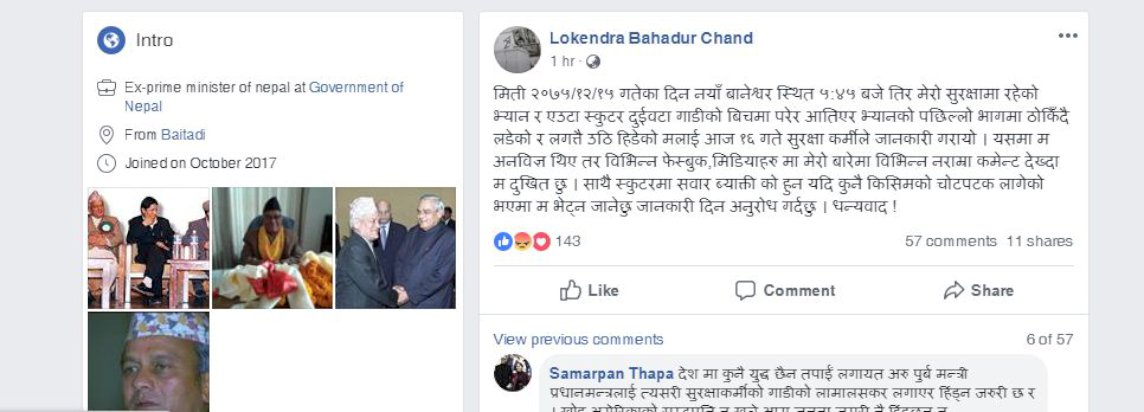चन्दले सामाजिक सञ्जालमार्फत भनेका छन् \'मिती २०७५/१२/१५ गतेका दिन नयाँ बानेश्वर स्थित ५:४५ बजे तिर मेरो सुरक्षामा रहेको भ्यान र एउटा स्कुटर दुईवटा गाडीको बिचमा परेर आतिएर भ्यानको पछिल्लो भागमा ठोकिँदै लडेको र लगत्तै उठि हिडेको मलाई आज १६ गते सुरक्षा कर्मीले जानकारी गरायो । यसमा म अनविज्ञ थिए तर विभिन्न फेस्बुक,मिडियाहरु मा मेरो बारेमा विभिन्न नराम्रा कमेन्ट देख्दा म दुखित छु । साथै स्कुटरमा सवार ब्याक्ती को हुन यदि कुनै किसिमको चोटपटक लागेको भएमा म भेट्न जानेछु जानकारी दिन अनुरोध गर्दछु । धन्यवाद !\'