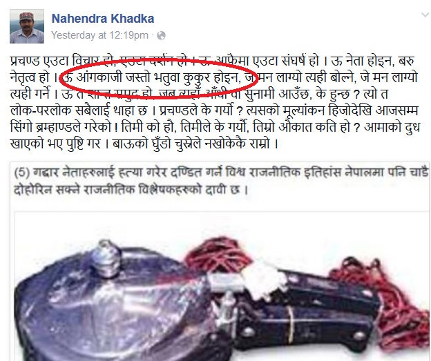 \"Fullscreenकाठमाडौं,  एमाओवादी अध्यक्ष प्रचण्डको ज्यानमार्ने धम्कि दिएपछि जनजाति नेता आङ्काजी शेर्पा विरुद्ध एमाओवादी नेता कार्यकर्ता खनिएका छन् । उनलाई कार्वाहीको माग गर्दै सामाजिक सञ्जाल फेसबुक तथा टुईटरमा तिब्र आलोचना भइरहेको छ  । एमाओवादी स्थायीसमिति सदस्य विश्वभक्त दुलाल आहुतिले शेर्पालाई सिआइएद्धारा परिचालित मान्छेको संज्ञा दिएका छन् ।  उनले सामाजिक सञ्जाल फेसबुकमा नै ‘मिस्टर आङ्काजी सिआइएको एजेन्ट हो ?’ भन्दै प्रश्न गरेका छन् । त्यस्तै गरि एमाओवादी राज्य समिति सदस्य तथा किसान नेता नहेन्द्र खड्काले शेर्पालाई भतुवा कुकुरको संज्ञा दिएका छन् । ‘प्रचण्ड एउटा विचार हो, एउटा दर्शन हो । ऊ आफैमा एउटा संघर्ष हो । ऊ नेता होइन, बरु नेतृत्व हो ।’ खड्काले आफ्नो पार्टी अध्यक्ष प्रचण्डको बचाउ गर्दै लेखेका छन्, ‘ऊ आंगकाजी जस्तो भतुवा कुकुर होइन, जे मन लाग्यो त्यही बोल्ने, जे मन लाग्यो त्यही गर्ने ।’ एमाओवादीकै कार्यकर्ता जनक वर्तौलाले शेर्पाको आँखा निकालीदिने धम्की दिएका छन् । सामाजिक सञ्जाल फेसबुक मार्फत नै उनले लेखेका छन् ‘हाम्राा आदर्णीय नेतालाई छु न त के टेडा आँखाले हेरिस् भने आँखा निकालिदिन्छु ।’\"Fullscreen प्रचण्डकै पुत्र प्रकाश दहालले सामाजिक सञ्जालमा यस अघि नै शेर्पाको अभिव्यक्तिको विरोध गदै आफ्नै बाबु प्रचण्डको बचाउ गरेका थिए ।  त्यस्तै गरि यस अघि नै एमाओवादी केन्द्रिय सदस्य तथा प्रचण्डका स्वकीय सचिव चुडामडि खड्काले शेर्पाको भनाईलाई हावादारी भन्दै टिप्पणी गरेका थिए । यता गृहमन्त्रालयले भिआइपीलाई सुरक्षा चुनौती दिएको भन्दै शेर्पाको खोजी गर्ने जनाएको छ । यस अघि शेर्पाले सामाजिक सञ्जाल फेसबुकमा एमाओवादी अध्यक्ष प्रचण्डलाई ज्यान मार्ने धम्की दिँदै स्ट्याटस लेखेका थिए । उनको स्ट्याटसपछि विभिन्न निकायबाट उनको विरोध हुँदै आएको छ ।