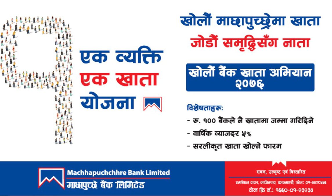 काठमाडौं । माछापुच्छ्रे बैंकले नेपाल सरकारको ‘खोलौ बैंक खाता अभियान, २०७६’ अन्तर्गत ‘एक व्यक्ति एक खाता योजना’ ल्याएको छ । यस योजना अन्र्तगत खाता खाल्नेलाई बैंकले नै एक सय रुपैयाँ खातामा जम्मा गरि दिनेछ ।