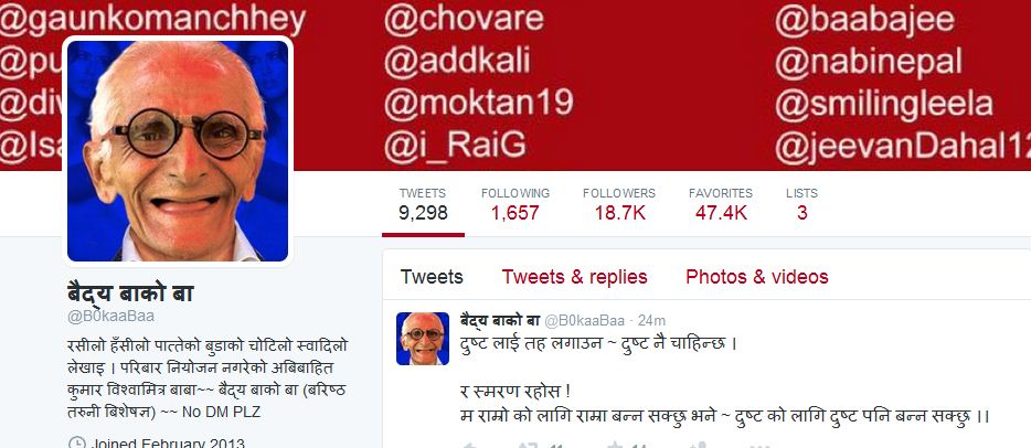 \"baidhyaकाठमाडौं, सामाजिक सञ्जाल ट्विटर प्रयोगकर्ताको संख्या नेपालमा अत्याधिक छ । ट्विटरमा झूम्मिनेमा पत्रकार, लेखक, बुद्धिजिवी, राजनीतिक दलका कार्यकर्ता अग्रपंक्तिमा छन् । उनीहरु ट्विटरमै एक अर्काको विरोध या समर्थन गर्छन् । केहि पत्रकार ट्विटरमै कुनै घटनाको ब्रेकिङ गर्न आतुर हुन्छन्  । कुनै राजनीतिक निर्णय वा कसैको अभिव्यक्तिलाई लिएर अन्दाधुन्द समर्थन वा विरोध गर्नेहरुको जमात ट्विटरमा ठूलो छ । ट्विटेहरुको  दैनिक बहस हुने चौतारीको रुपमा ट्विटरलाई लिन सकिन्छ । यस्ता बहसहरुमा आफ्नो वास्तविक नाम भूमिगत राखेर ट्विटरमा अर्कै नामले छाउनेहरुको जमात छ ट्विटरमा । यस्ता छन् हास्यास्पद् नाम जसलाई हामीले यहाँ प्रस्तुत गरेका छौं । बैद्य बाको बाः १८ हजार भन्दा बढी फलोअर रहेको बैद्य यीनको ९ हजार भन्दा बढी ट्विट छ । एक वृद्धको तस्विरलाई प्रोफाइलमा राखिएको छ । आफ्नो बारेमा उट्पट्याङ कुराहरुले भरेका छन् । दुई खुट्टे बाहुन : यस्तो नाम राख्ने यी युवा झापा तिरका हुन् । उनले आफ्नै बारेमा यसरि लेखेका छन् ‘बाहुन हु लोबि छु तर Follow गर्नेलाई follow back गर्छु । ईमानदार छु Retweeted , favourite गर्छु । म झापाली हो TL मा langlang गर्नेको दात झार्छु । होशियार । ट्वाँके काका:  आफ्नो नाम उनले योगेश भट्टराइ बताएका छन् तर ट्विटरमा ट्वाँके काका राखेका छन् । ‘आफ्नै दाह्री बनाउन आउँदैन मलाई भो देश बनाउने कुरा गर्दिन आउदैन ।’ उनले आफ्नो बारेमा लेखेका छन् । \"boko\"बोको:उनको फलोअर मात्रै ११ हजार भन्दा बढी छ  । उनले ट्विट मात्रै १९ हजारको हाराहारीमा गरिसकेका छन् ।  ‘दुइ खुट्टे बोको....  स्लिल , अस्लिल दुबै लेख्छु , हेरेर फलो गर्नुस , पछि ल्याङ ल्याङ गर्न नपाइ, काठमाडौ, नेपाल  ’ उनले आफ्नो बारेमा लेखेका छन् । जुङ्गे: करिब ८ हजारको हाराहारीमा जुँगेको फलोअर छन् । ट्विट मात्रै २७ हजार भन्दा बढि गरेका छन् । ‘छिमेकीलाई हँसाउने भए स्वास्नीले कुटि या न्ँ ले लुटि भन्दिनुस, आफु हिन्नासाथ लडि लडि हास्छन ञ्केटाले दाउ र केटीले भाउ खोजेको मनपर्दैन हास्य ब्यंग्य’  उनले आफ्नो बारेमा लेखेका छन् । अन्य हास्यास्पद नामहरु यस्ता छन् : \"1\"रेलगाडी छुक्छुक्छुक \"2\"भूत \"3\"गोज्याङ्ग्रे \"4\"फन्नि मा‘राज  \"5\"डाकु \"6\"भिरखर्के \"7\"फाटेको कन्भर्स \"8\"बारुलो \"9\"जेनेरेटर \"10\"बैधबाको ठुल्दाई \"12\"च्यान्टे \"13\"भूँडीफोर \"14\"ब्याग्कार म \"15\"जन्तरे छिप्पेको बालक