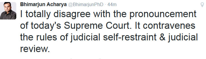 \"bhimarjun\"३ असार, काठमाडौं । वरिष्ठ कानुनविद् भिमार्जुन आचार्यले सर्वोच्चको फैसला प्रति आफ्नो असहमति पोखेका छन् । उनले सामाजिक सञ्जाल ट्विटरमा सर्वोच्चको फैसलाको विरोध गरेका हुन् । उनले फैसलाको विरोध गर्दै न्यायिक छानविन गर्न माग समेत गरेका छन् ।  ‘यसले न्यायको संरक्षण गर्दैन, ’ उनले लेखेका छन् ‘यो फैसलाको न्यायीक छानवीन हुनुपर्छ ।’ शुक्रबार सर्बोच्च अदालतले चार दलबीच भएको १६ बुँदे सहमति कार्यन्वयन नगर्न निर्देशन दिएको थियो ।